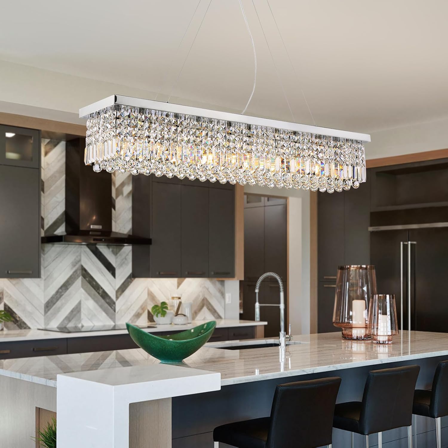 - 10-Lights Dining Room Chandelier: Siljoy kitchen chandelier light fixtures fits 10xE12 bulbs (not included). This modern crystal chandelier can also be dimmed when you use dimmable bulbs and compatible dimming switches, giving you the most comfortable illumination. This rectangle chandelier is an art decoration for your dining room, kitchen island, and living room.