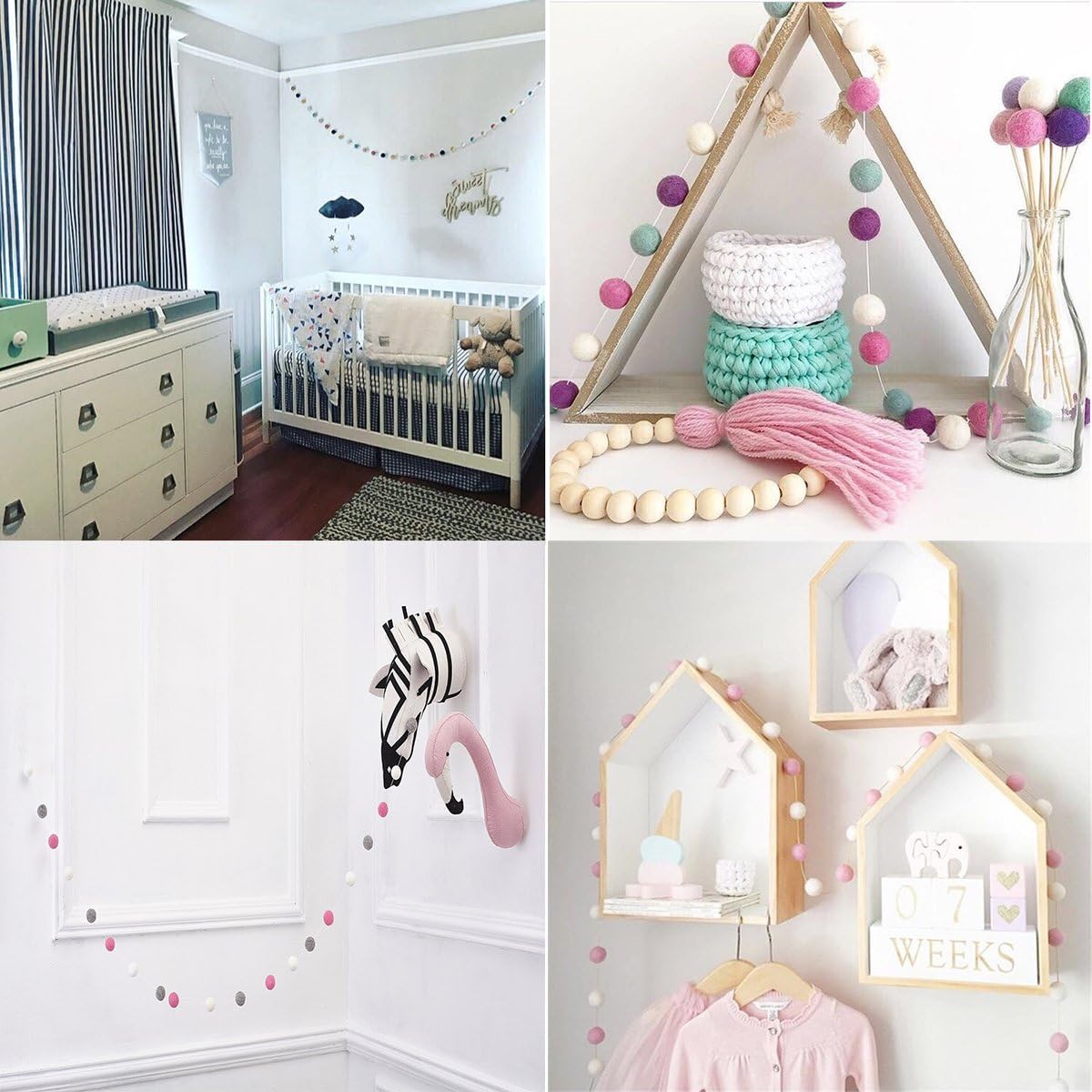 - Pom Pom Garland: This garland is made with 20mm felt balls. 35 balls are hand-stitched to the string. ▶▶Balls are NOT in fixed position in the garland.
