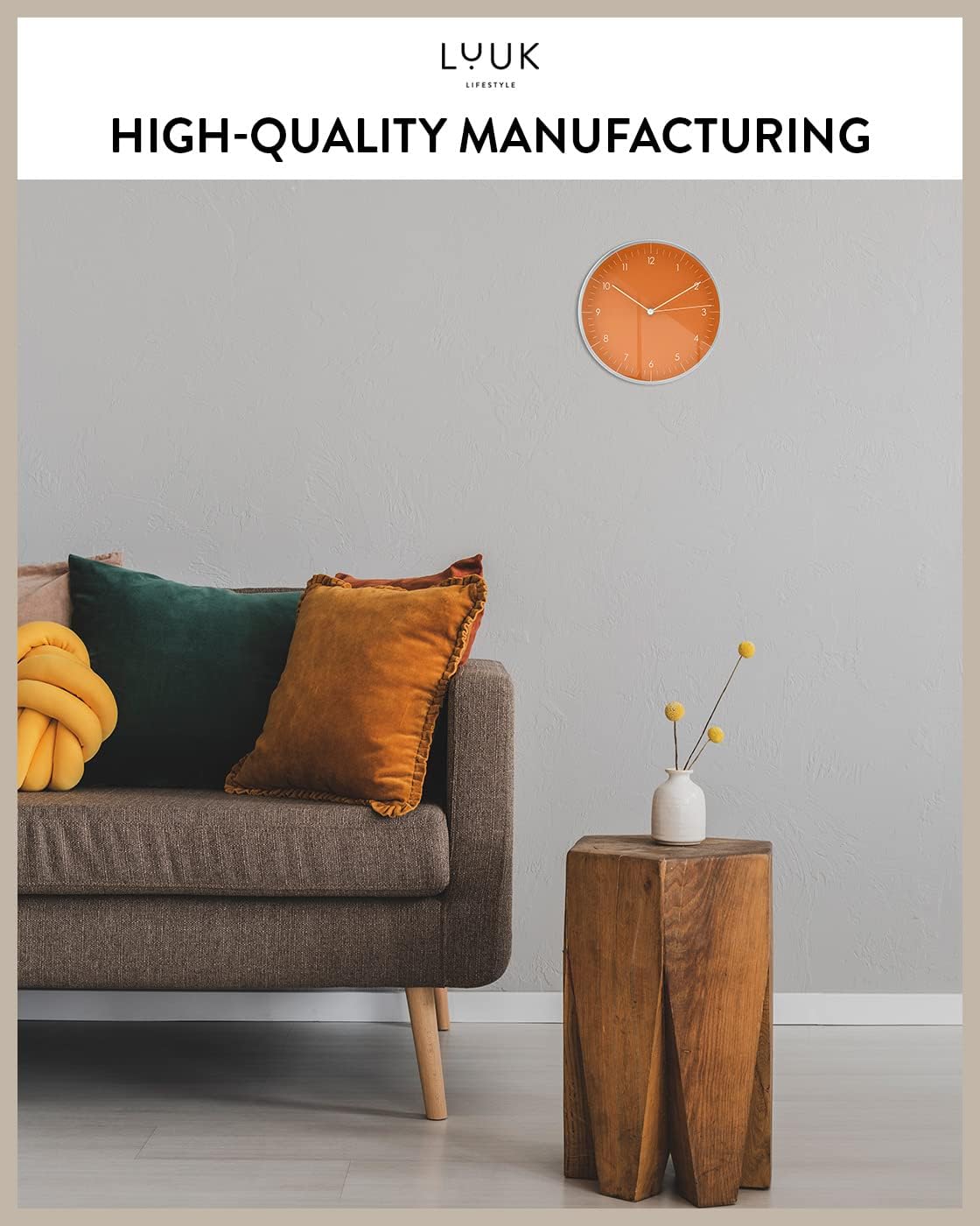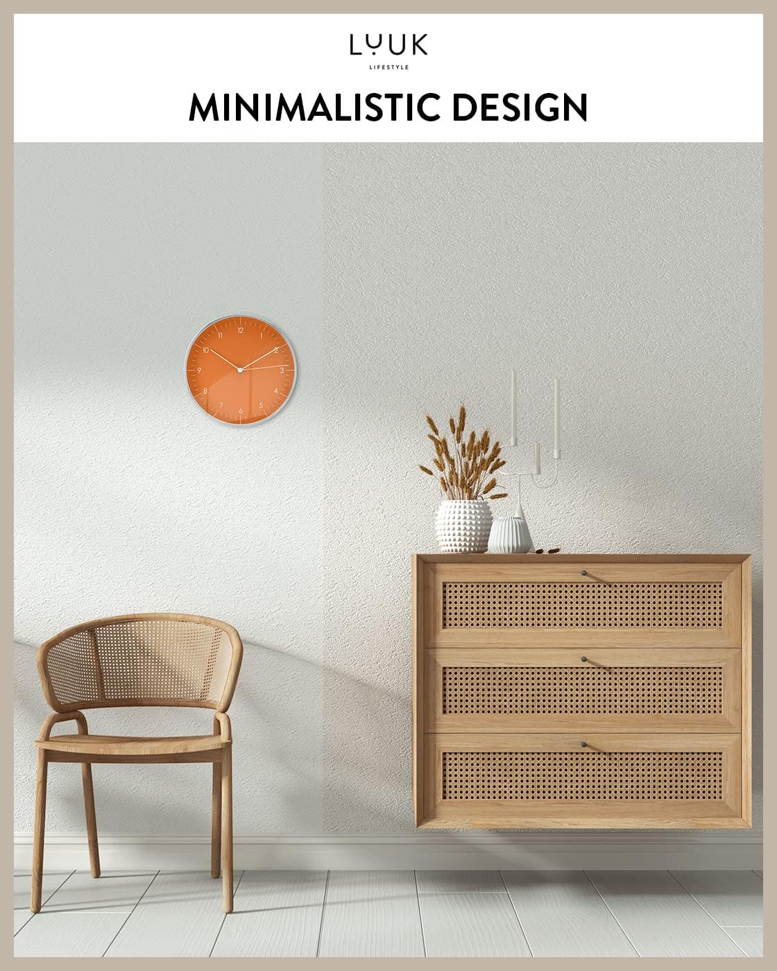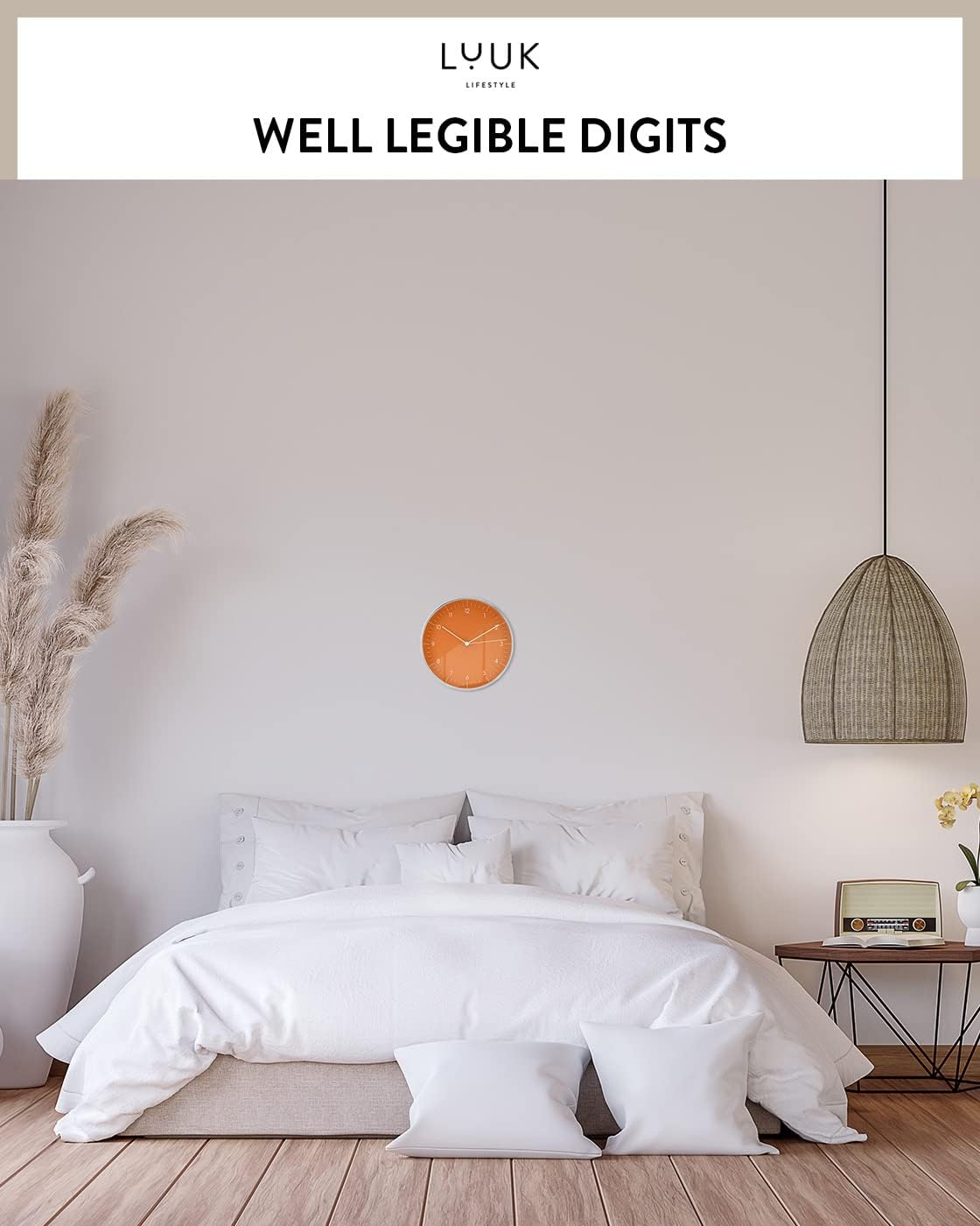 - SILENT MOVEMENT: This non-ticking quartz wall clock, vividly designed in a bright orange color, comes with a second hand and embodies a minimalist, Scandinavian design; The Arabic numerals are readable from a distance