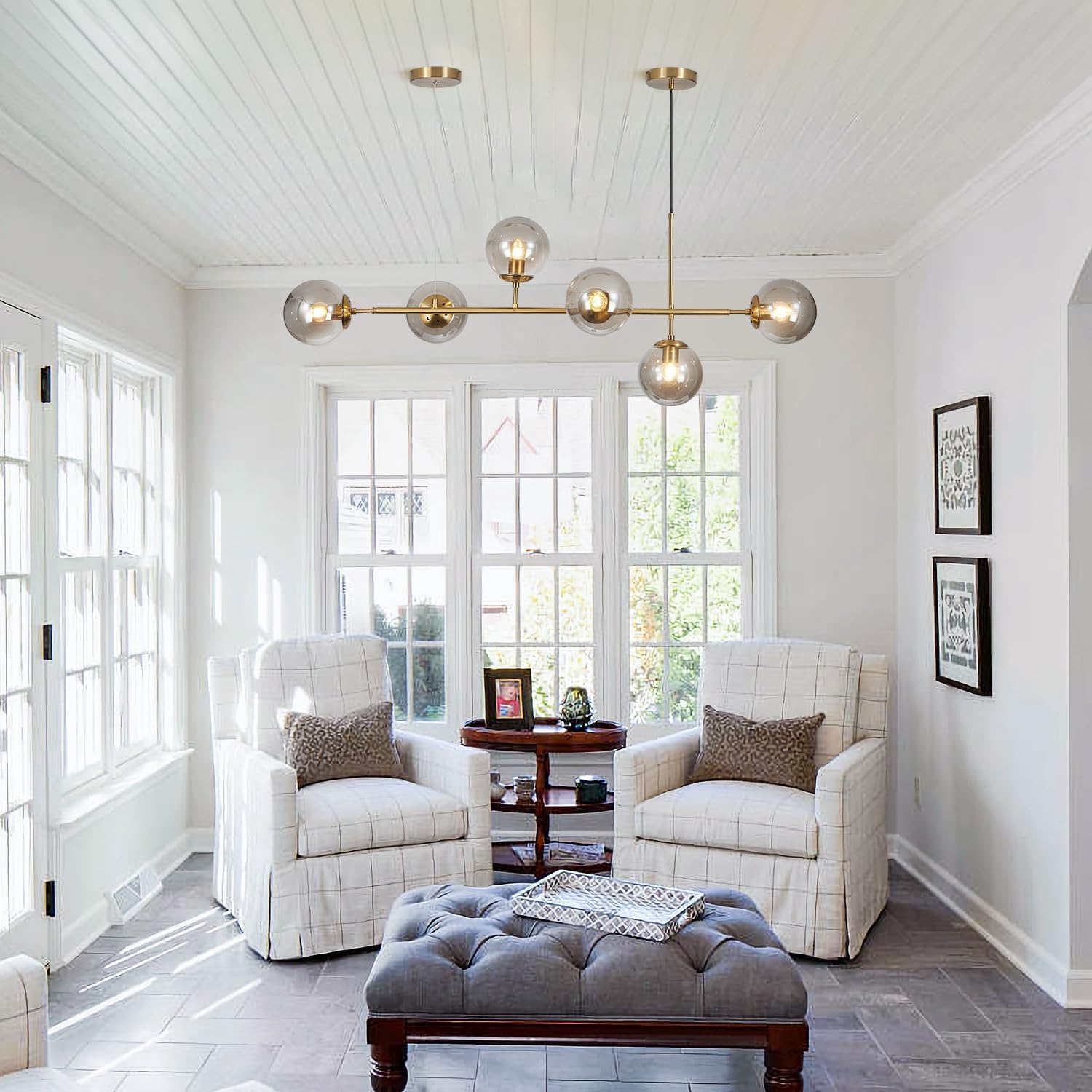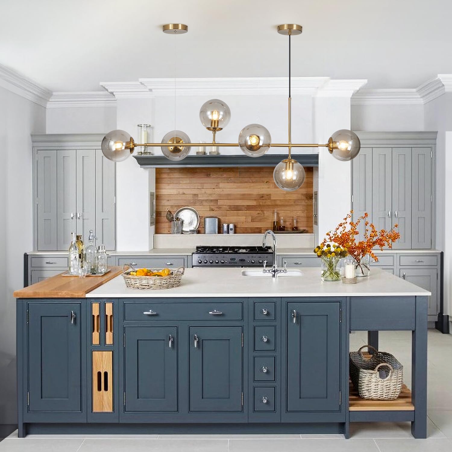 - 【Mid Century Rectangle Chandelier】The linear chandelier for kitchen island features six smoke gray glass shade and a long metal frame, which is characterized with a modern flair. The smoky glass shade diffuse the light to create a welcoming glow, adding a retro modern accent and ample illumination. The brushed brass hanging pendant light brings the drama of mid century modern pendant lighting over a kitchen island. The globe kitchen island chandelier is highlighting personality, and is favored by more and more people!