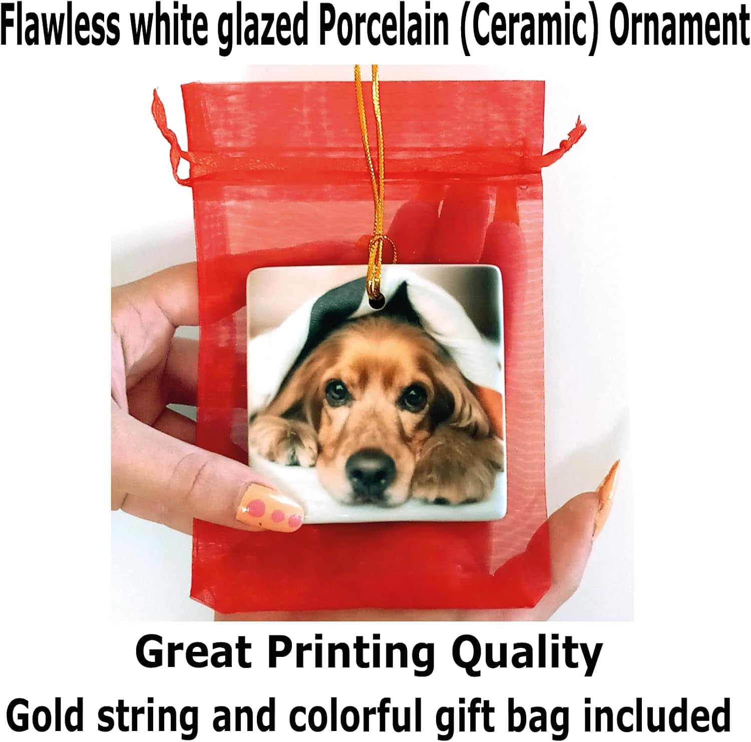 Personalized Christmas Ornament, Add Photo Text or Art Design and Make Your own Customized Porcelain Ceramic Ornament, Gold String and Gift Bag Included (Square)
