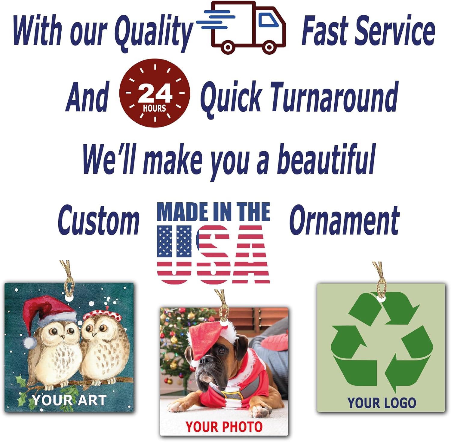 - Easy online designer: Make your own ornament, upload your photos, art works or logo than add text. Click customize now