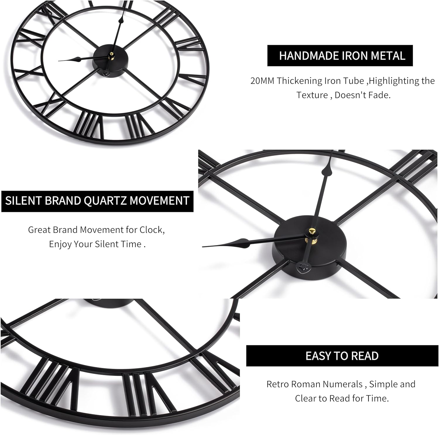 - 【INDUSTRIAL CLOCK】Large retro metal clock in hollowed-out design, frame of the wall clock is hand-made by solid iron, and high- quality materials ensure the robustness and retro appearance of the Roman wall clock.