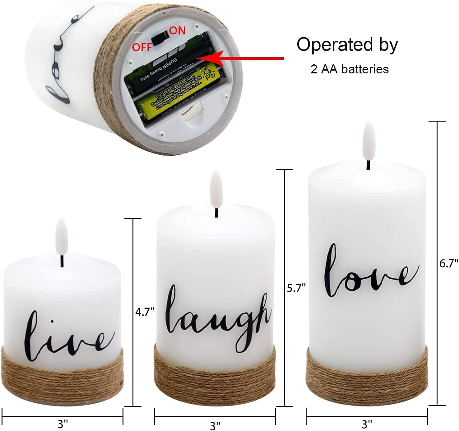 - Live Laugh Love: Each candle is 3 inch wide and 4.7β, 5.7β and 6.7β tall, requires 2 type AA batteries (not included) and are made of highest quality wax.