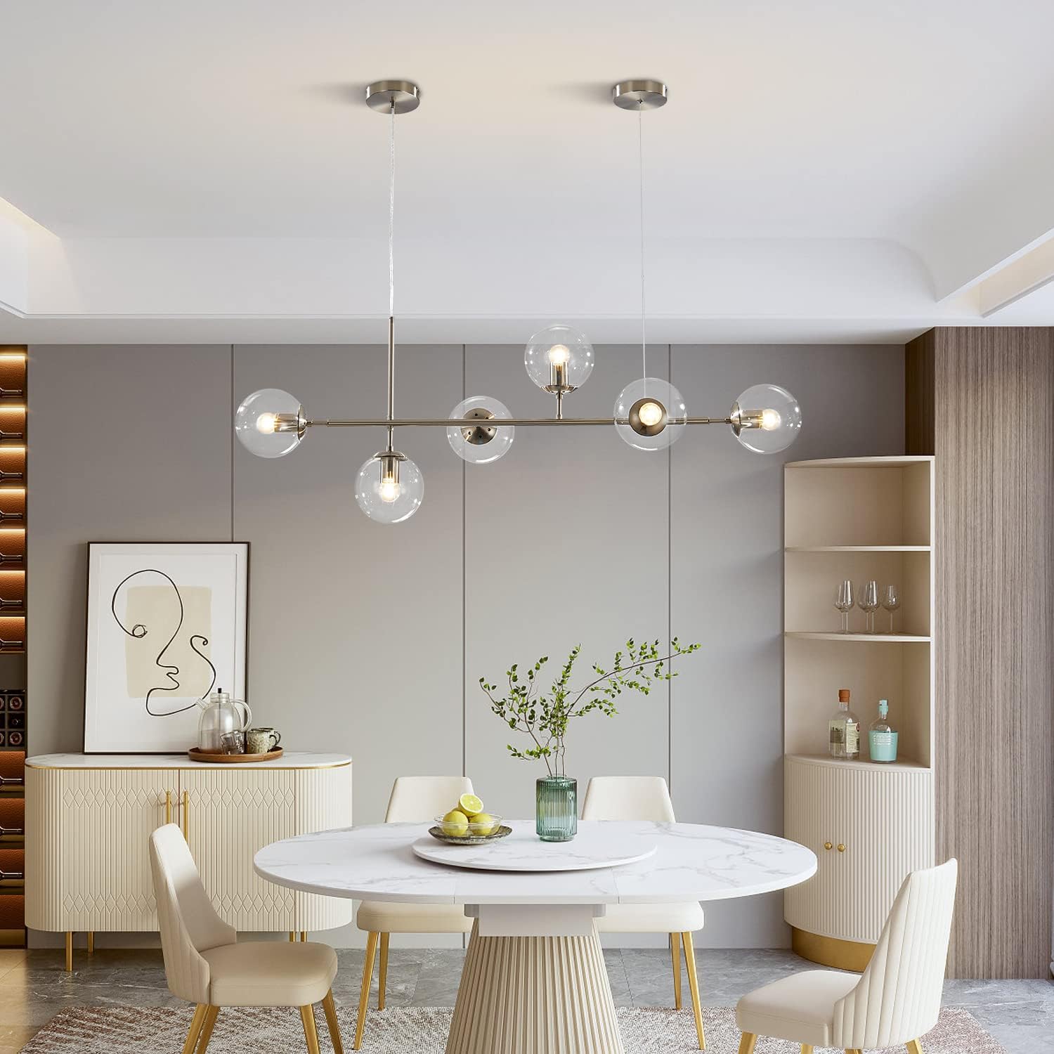 - Classic Globe Design: The brushed nickel kitchen island pendant lighting crafted from metal in a painted chrome finish, features with 6 clear glass globe shades. Simple line structure shape, parallel and vertical lines match to reflect a full three-dimensional sense, with a strong artistic tone, enjoy the geometric aesthetics of lines