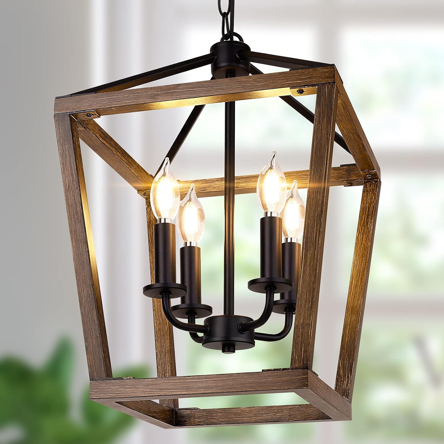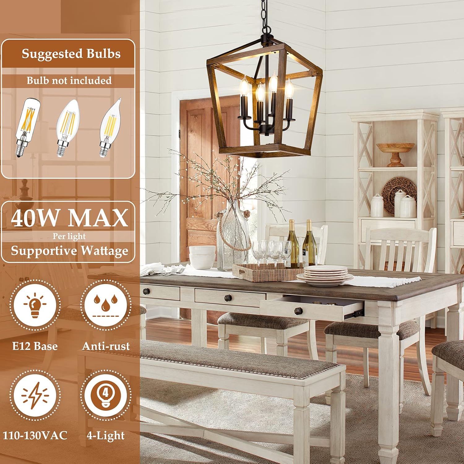 Farmhouse Chandelier Light Fixture for Kitchen Dining Room, 4-Light Rustic Pendant Hanging Ceiling Light Height Adjustable in Oak Wood Finish, Cage Lantern Lighting with E12 Base for Hallway Foyer