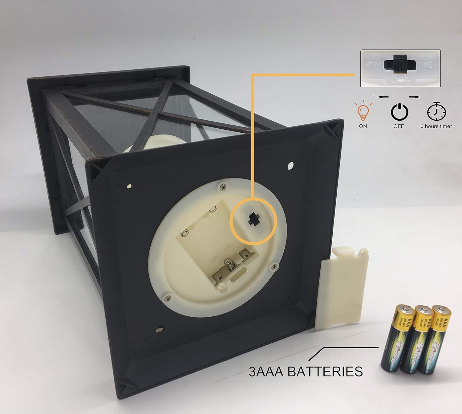 - ON/OFF/TIMER: Three switches at the buttom of the lantern for you to choose. As a regular light, you can choose to turn the lantern on when you want, or just turn it off at any time. And you can also choose the timer function, the candle lantern will left on for 6 hours than auto off and relight again after 18 hours. The warm flickering candle flame will accompany your family to sleep and turn off automatically.