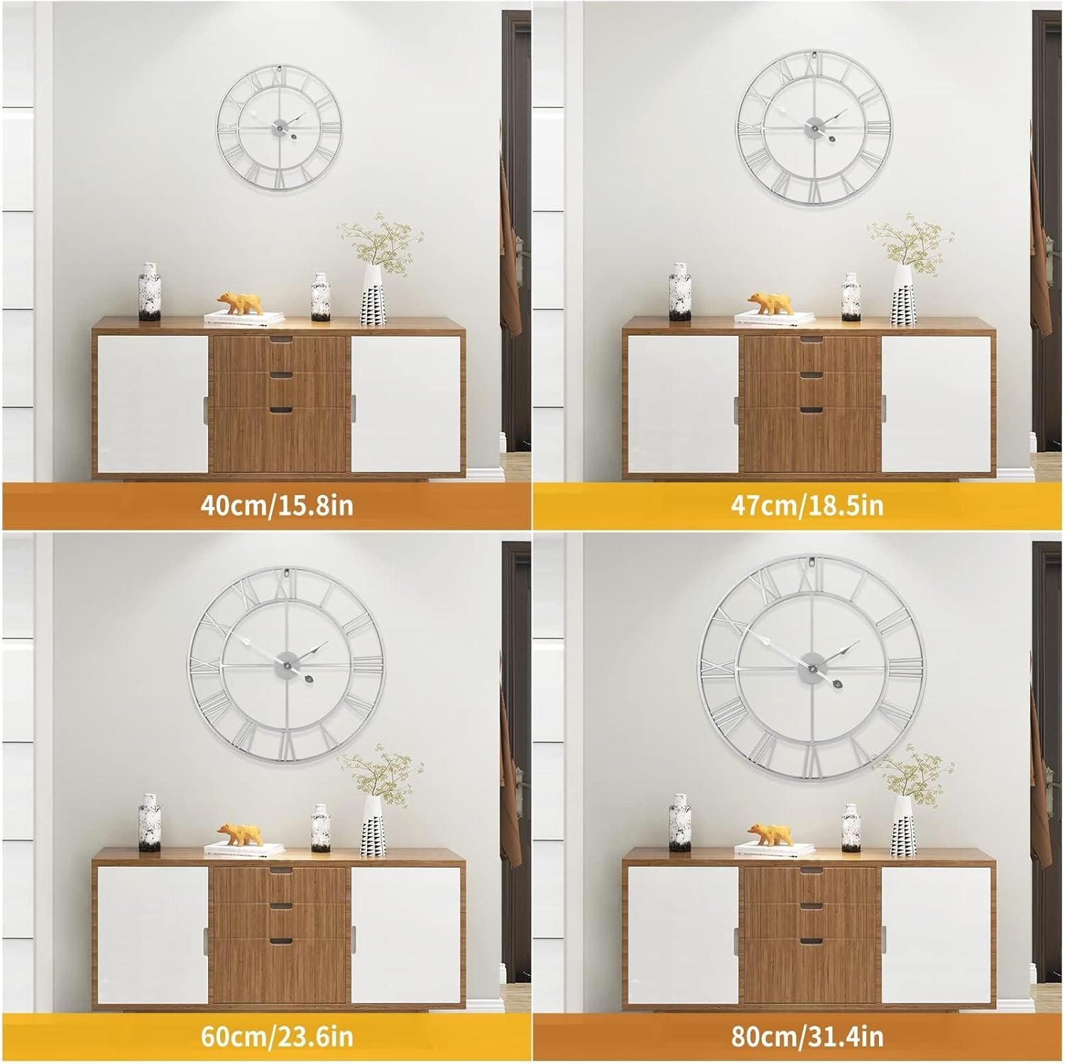 1st owned Large Wall Clock Silent Non-Ticking Roman Numerals Vintage Battery Operated (24 inch,18inch,16inch) Farmhouse Wall Clock for Living Room, Bedroom, Kitchen, Cafe Decor-Silver 47CM