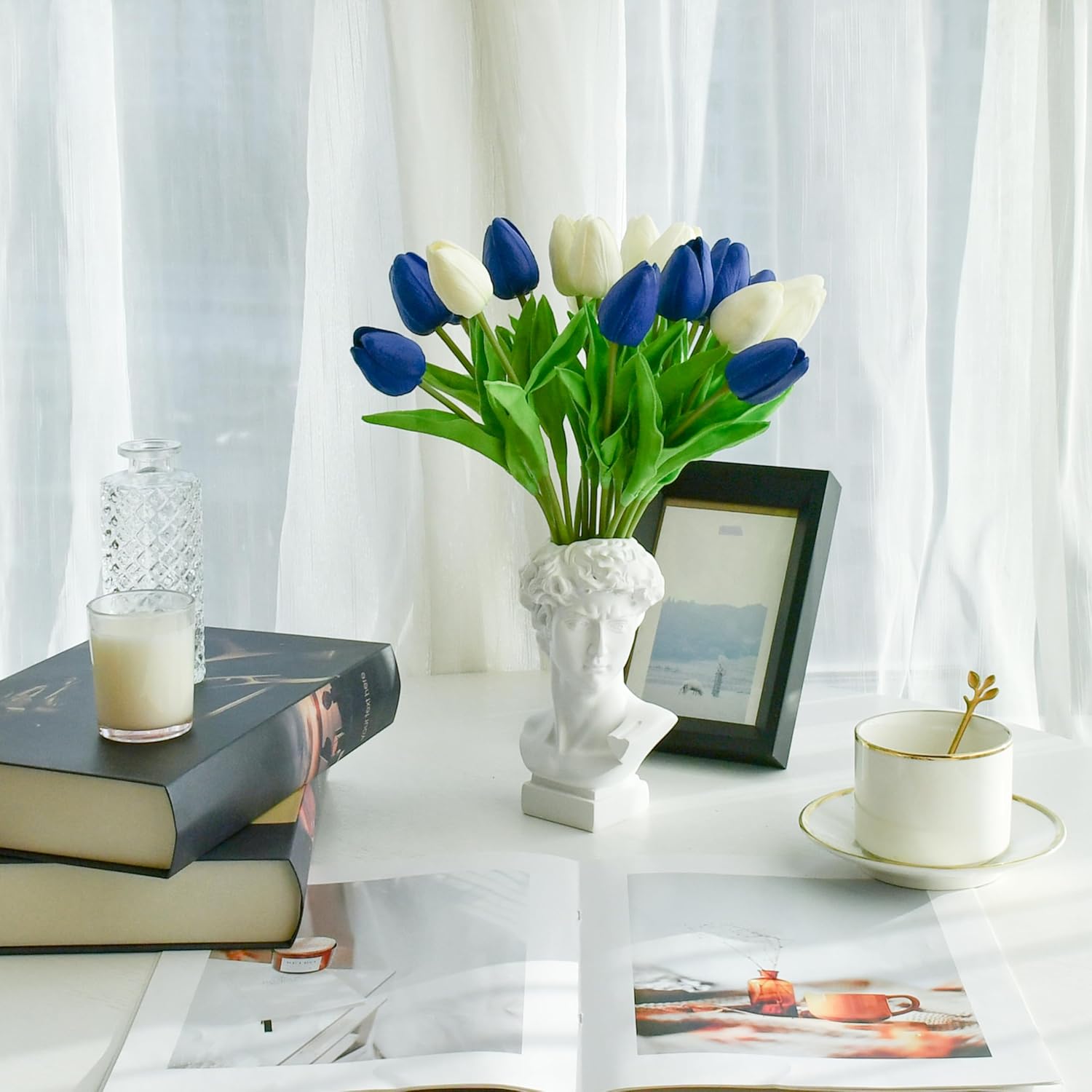 Mandy's Artificial Tulips 20 Stems Blue and White PU Faux Flowers for Wedding Home Decor 13.5 Inch