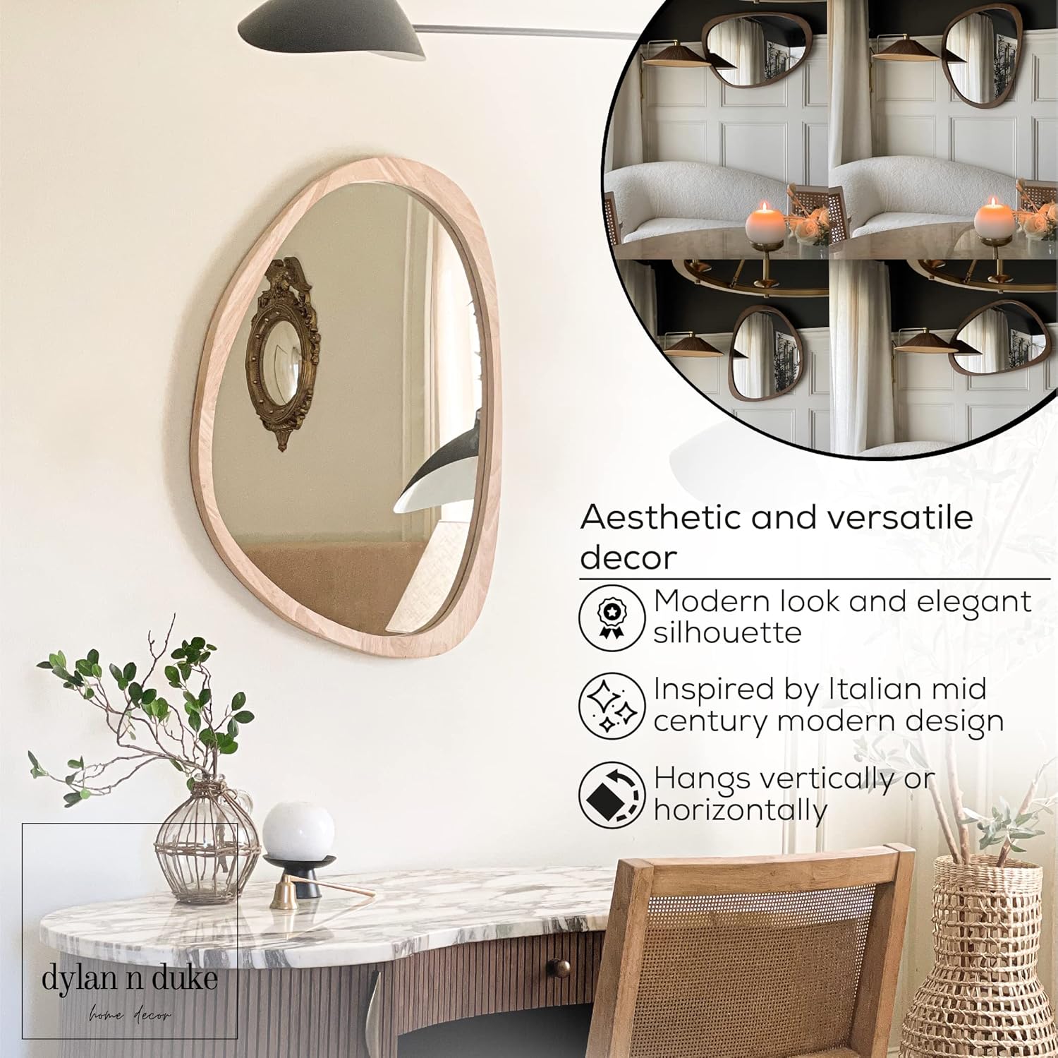 - [MID-CENTURY AESTHETIC DECOR] Celebrating the beauty of imperfection, this wood framed wall mirror is distinguished by its striking asymmetrical design. Crafted of beautiful wood, its fluid, undulating form feels at once organic and elegant, creating a one-of-a-kind focal point in your interior. Inspired by Italian mid-century design.