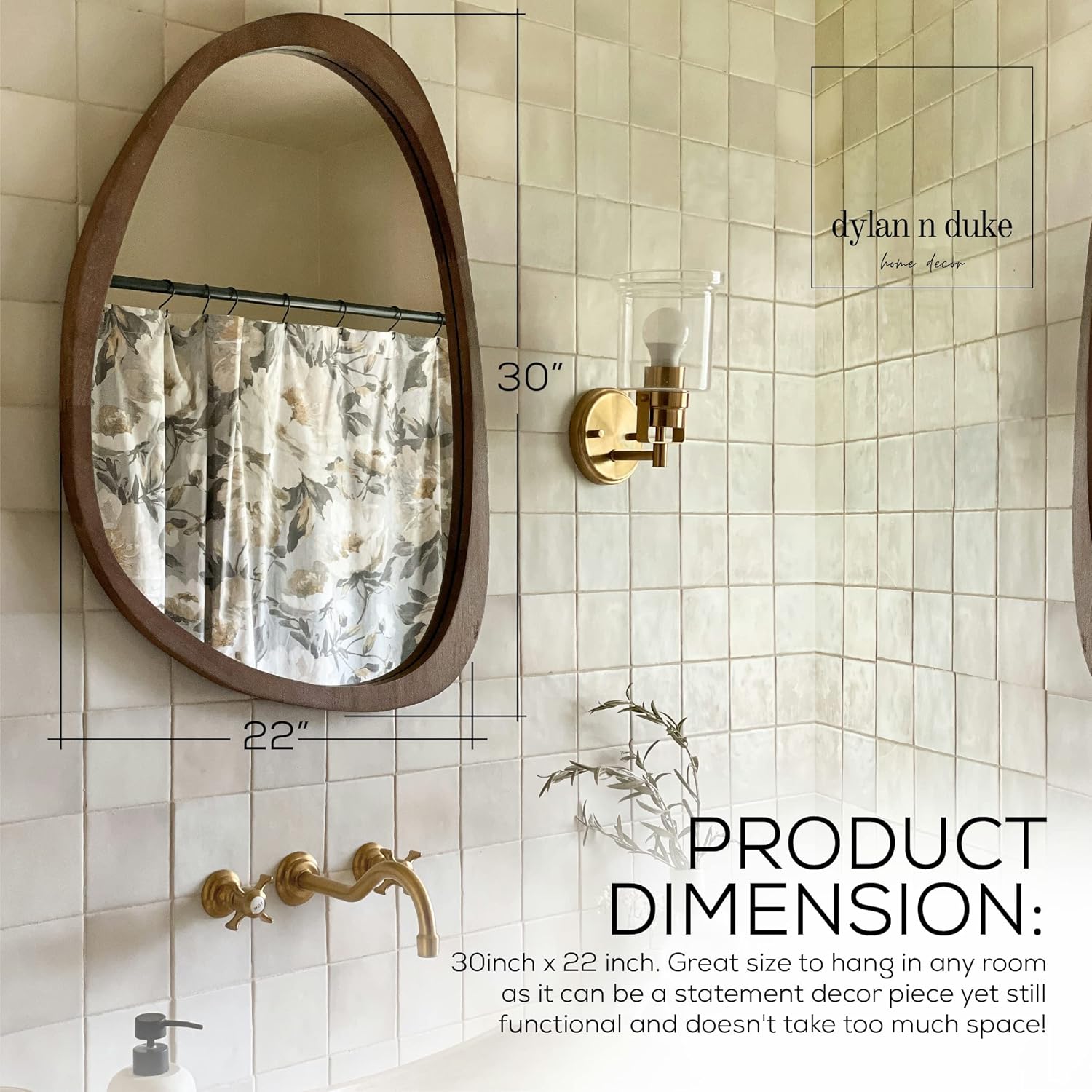 - [PERFECT SIZE FOR ANY ROOM] Mirror's diameter: 30inch x 22 inch. Great size to hang in any room as it can be a statement decor piece yet still functional and doesn't take too much space. The asymmetric mirror is easy to install. There are four hanger on the back of the mirror so you can hang it on the wall securely and easily. Hanging kit is included as well.