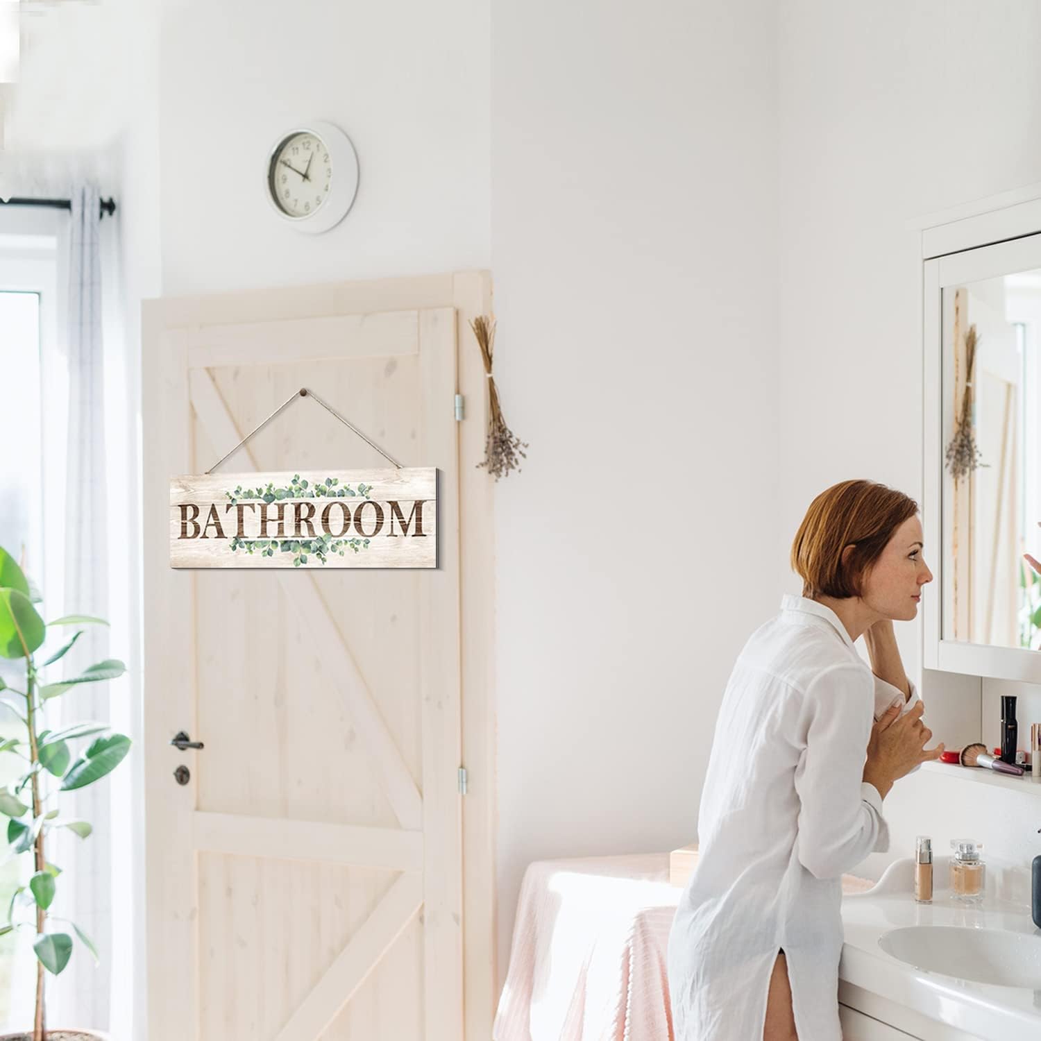 Bathroom Sign Wall Decor, Bathroom Wall Art with Plant Print, Rustic Farmhouse Wall Hanging Plaque Home Kitchen Decorative Bathroom, 4.7 x 13.7 inches