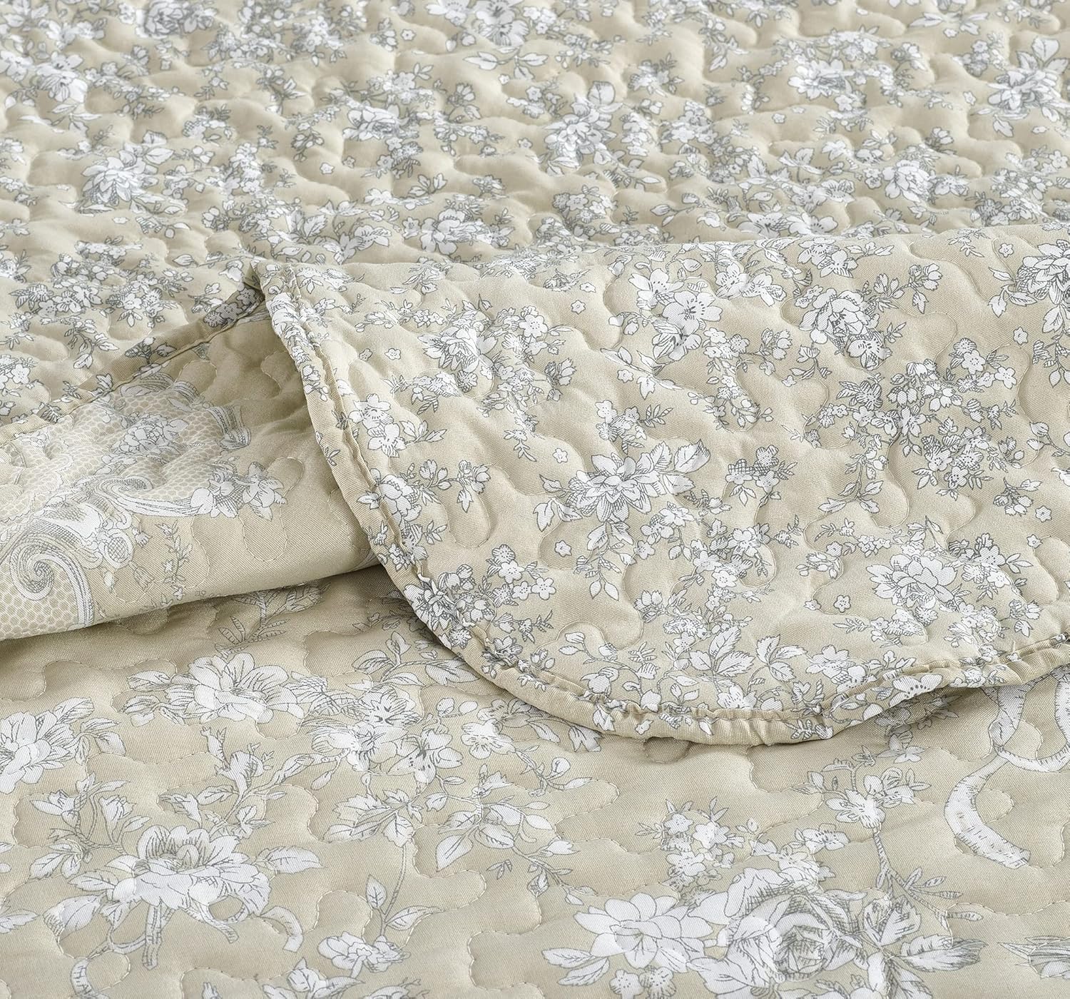 Brilliant Sunshine Classic Grey Floral Toile in Beige Background, 3-Piece Quilt Set with 2 Shams, Reversible Bedspread, Soft Lightweight Coverlet, All-Season, King, Beige