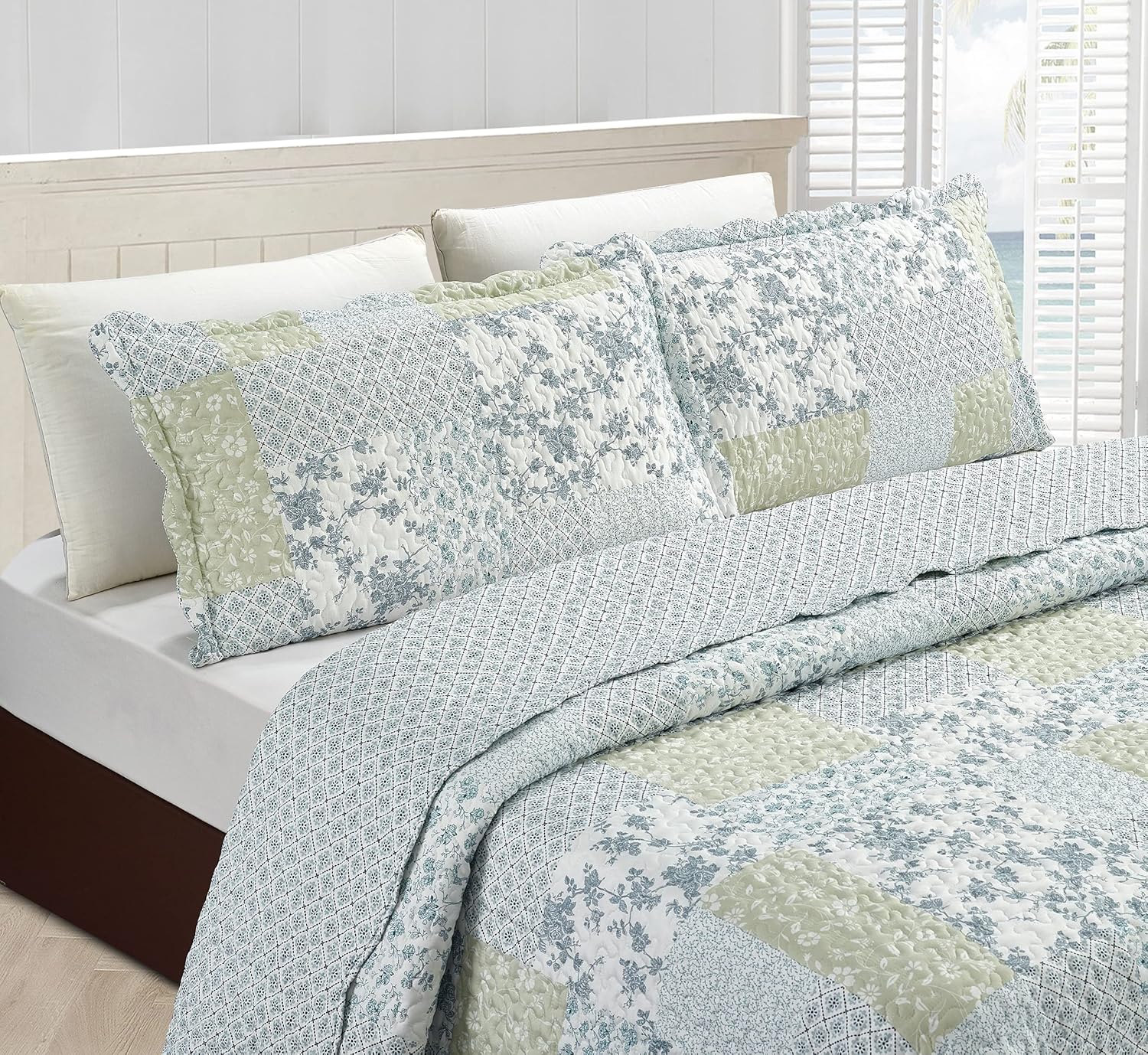 Brilliant Sunshine Multi Blue and Beige Floral Patchwork, 3-Piece Quilt Set with 2 Shams, Reversible Bedspread, Soft Lightweight Coverlet, All-Season, King, Blue White
