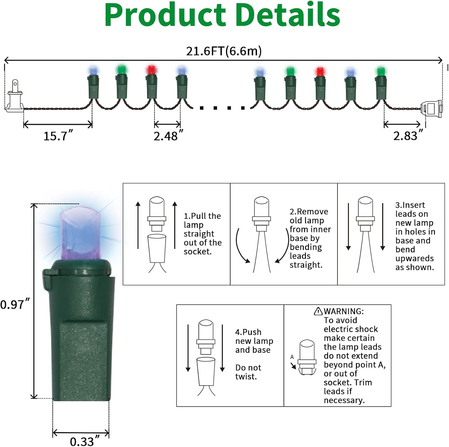 - 5mm LED Christmas Lights: 100 counts warm white 5mm wide angle stable LED string lights spaced 6.3 inches apart with green wire. 7.1 inch leads have a stackable male plug and 5.9 inch tails have a female plug for easy end to end connection.