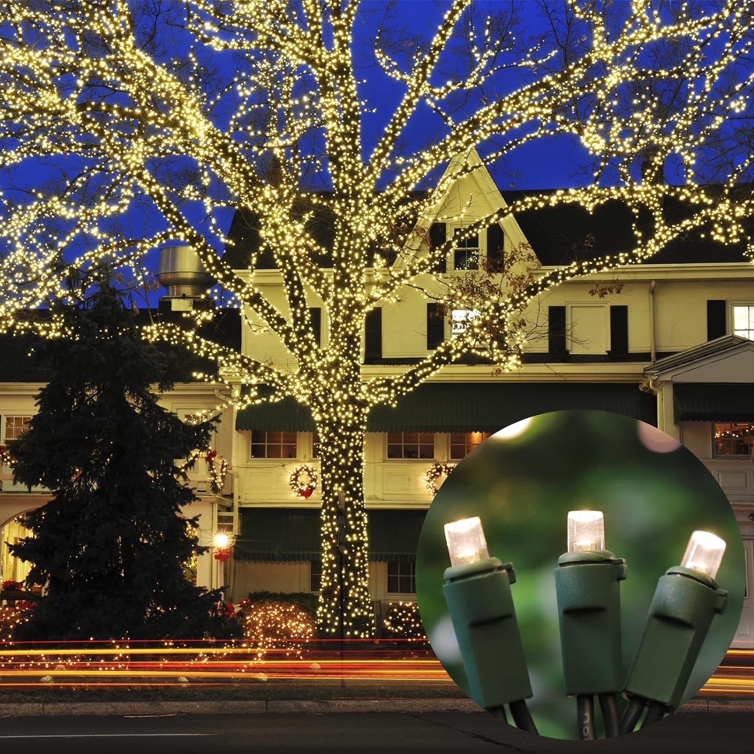 - 5mm LED Christmas Lights: 100 counts warm white 5mm wide angle stable LED string lights spaced 6.3 inches apart with green wire. 7.1 inch leads have a stackable male plug and 5.9 inch tails have a female plug for easy end to end connection.