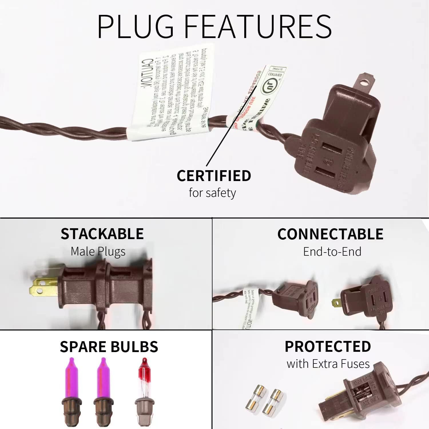 - Product Nature: Each mini halloween light set comes with end-to-end plug, can be connectable up to 5 sets (500 lights). Each bulb space 2.5in, 2.5V and 0.425W per bulbs, built-in 3A fuse for safe use. Extra bulbs and fuses are included.