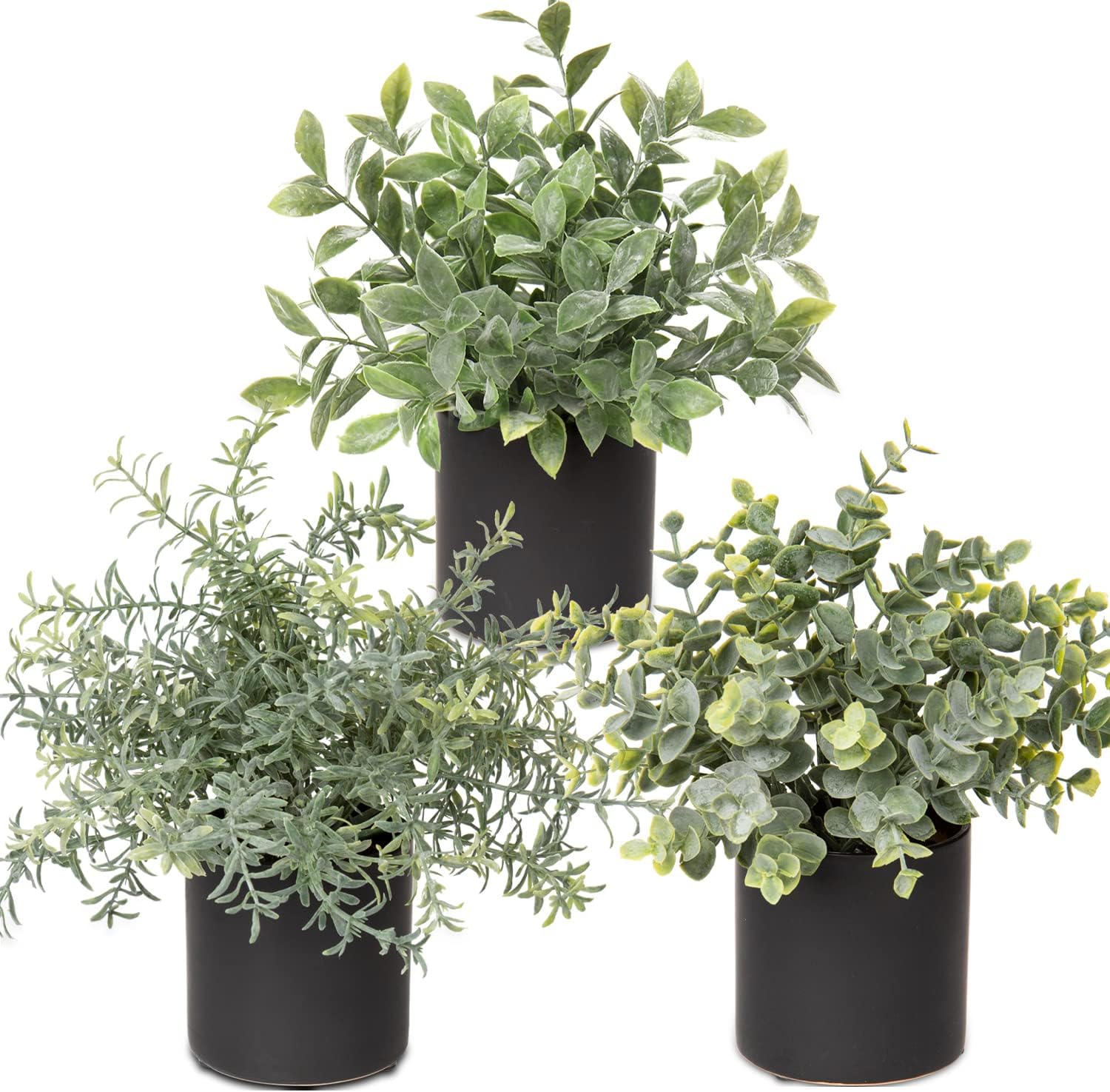 - Material - These 3 fake potted plants with fake plants are made of high quality PE plastic. Roots and branches have clear veins and the natural color gradient catches the eye at first glance.This set of Mini Potted Greenery features eucalyptus, boxwood and rosemary in assorted green tones, potted plant small perfect for creating a comfortable atmosphere you can enjoy for the years to come.