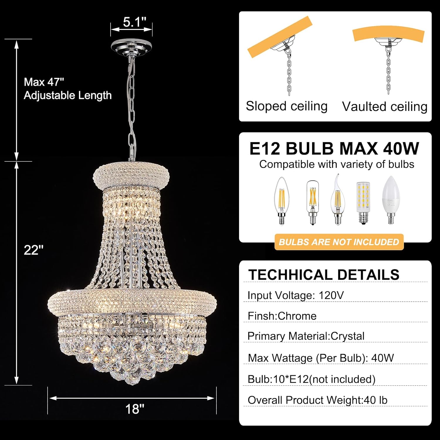 - Dimmable & 3-Color Changing: Use E12 x 10 bulbs, Each 40w max (bulb not included). 3-color LED light bulb is recommended. Fully dimmable when used with dimmable bulbs and a compatible dimmer switch.