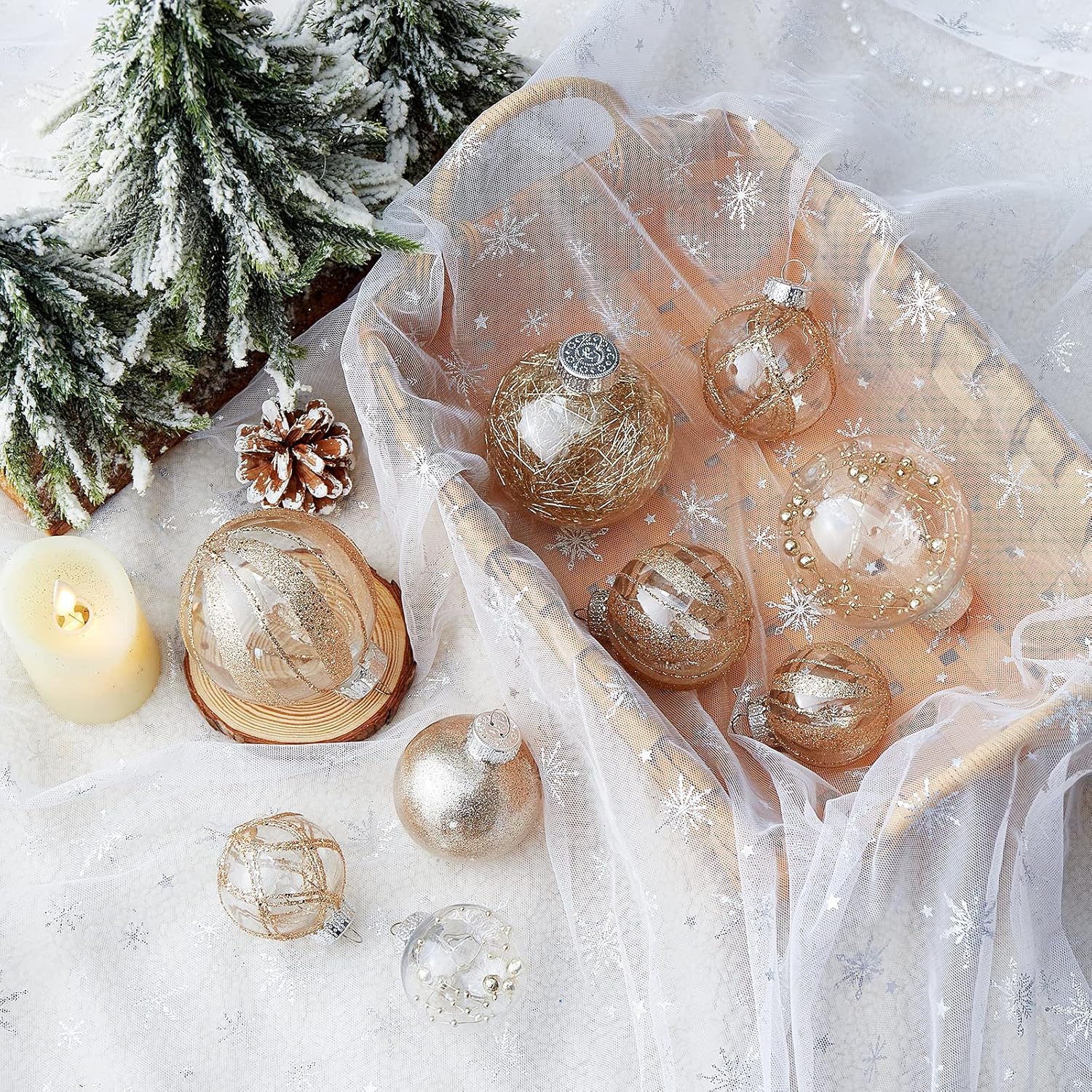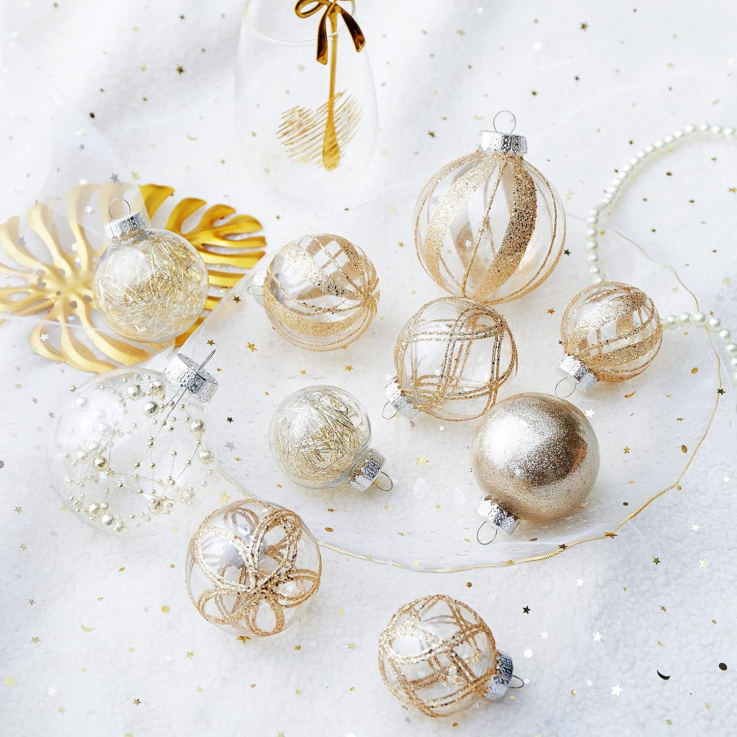 - Champagne Christmas Ball Ornaments--These 24 clear Christmas decorations are made of durable and environmentally friendly plastic with excellent shatter resistance. These Christmas balls have shiny decorations and a transparent glaze base, which are perfect for hanging on your Xmas tree and decorating your Home with them,this will become part of your vacation.