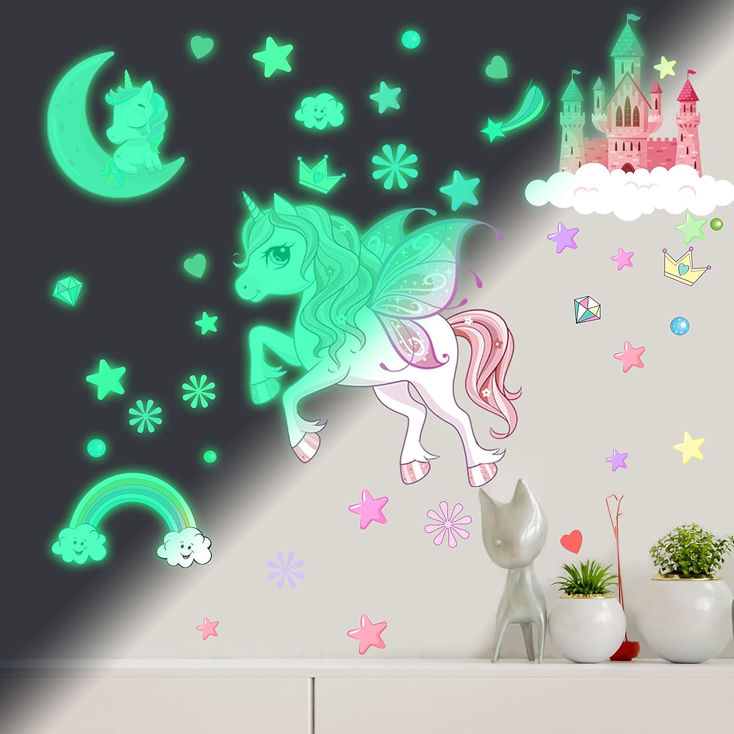 Glow in The Dark Stars Unicorn Wall Decals, Castle Moon Rainbow Stickers for Ceiling, DIY Unicorn Wall Decor for Nursery Girls Playroom, Kids Christmas Birthday Party Decoration