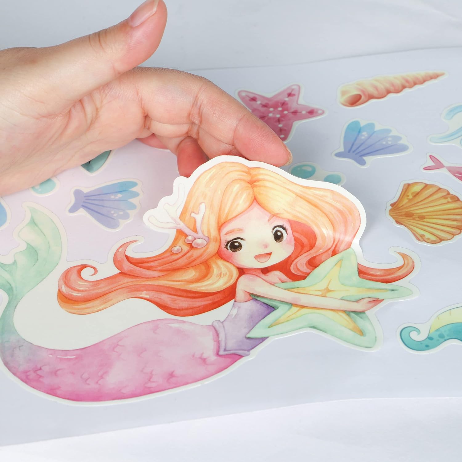 - 【Glow In The Dark Mermaid Decal】- This watercolor mermaid wall sticker has a total of 68 pcs, include mermaid, sea turtle, seahorse, seashell, jellyfish, starfish and aquatic. All the neutral patterns can be arranged freely, which allows kids to use their imagination to create their own style.