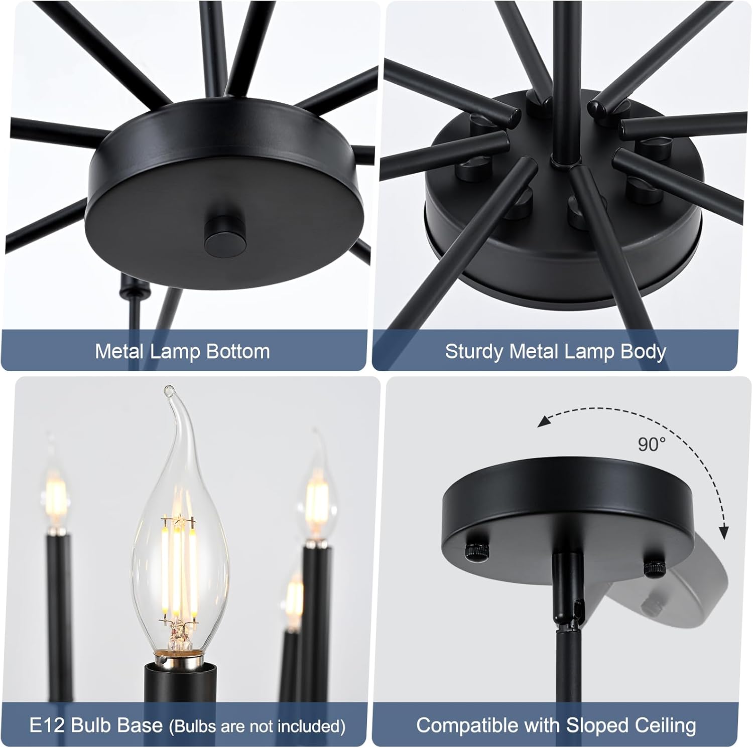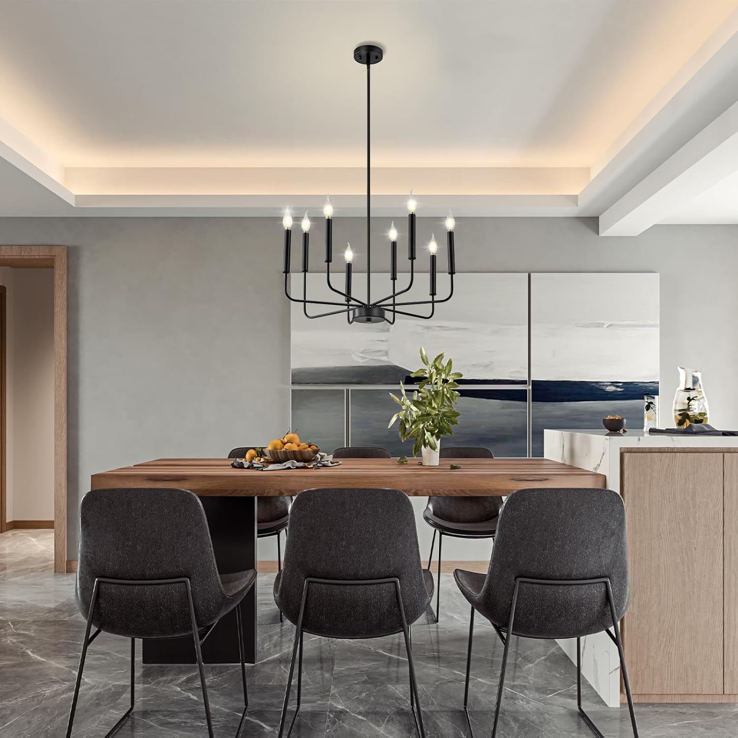 - Modern Fashion Design: A classy candelabra chandelier with different lengths of arms and black matte finish which allows you to clean easily. The appearance of 8 uneven arms look genuine and novel. The whole minimalist design is classic but not rigid. With this simple and retro look can upgrade your space that is elegant but generous