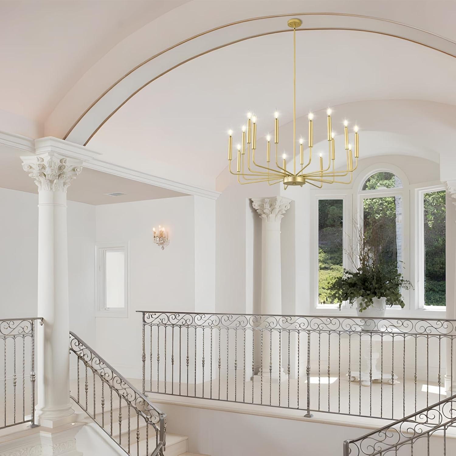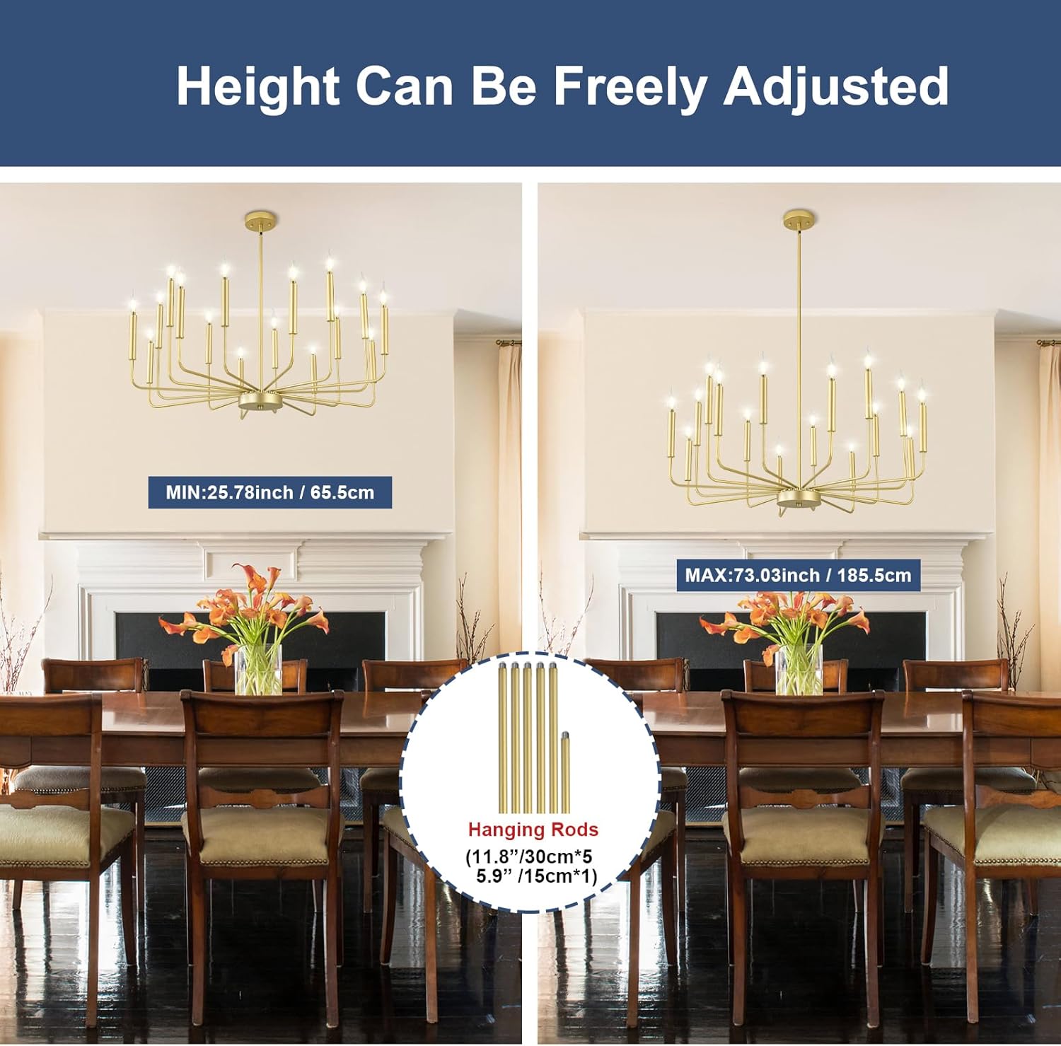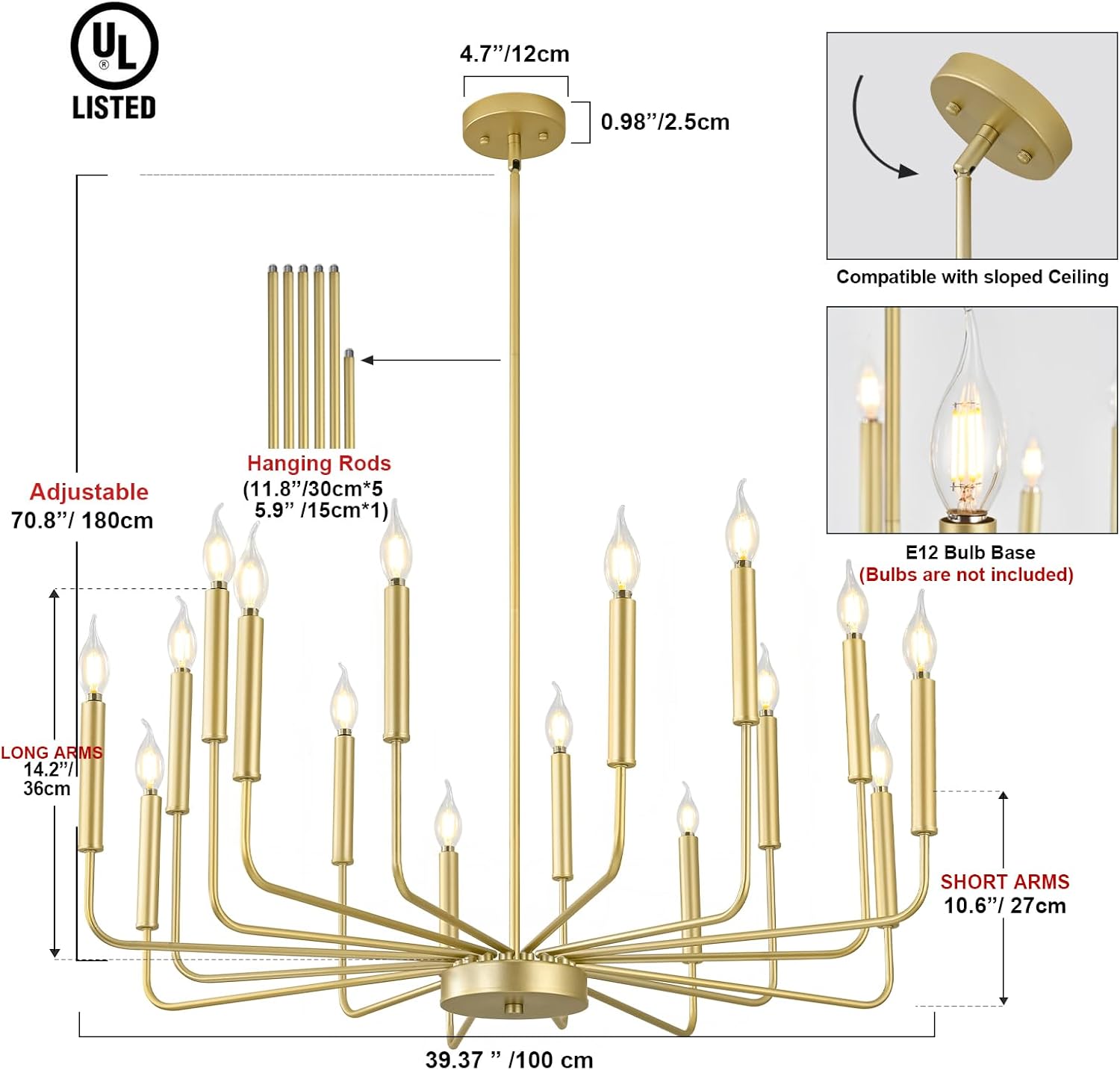 - Modern Fashion Design: A classy candelabra chandelier with different lengths of arms and gold matte finish which allows you to clean easily. The appearance of 16 uneven arms look genuine and novel. The whole minimalist design is classic but not rigid. With this simple and retro look can upgrade your space that is elegant but generous