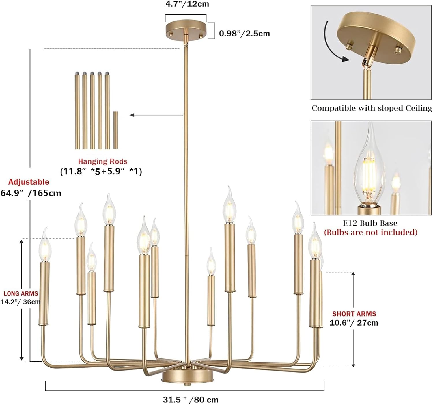 - BULBS and Dimmable: This candelabra chandelier supports E12 base bulbs(Bulbs NOT Included)/ 110-265 Volts. Max 40 Watts each bulb. It is only dimmable when used with dimmable bulb and compatible dimmer switch (switch Not included)