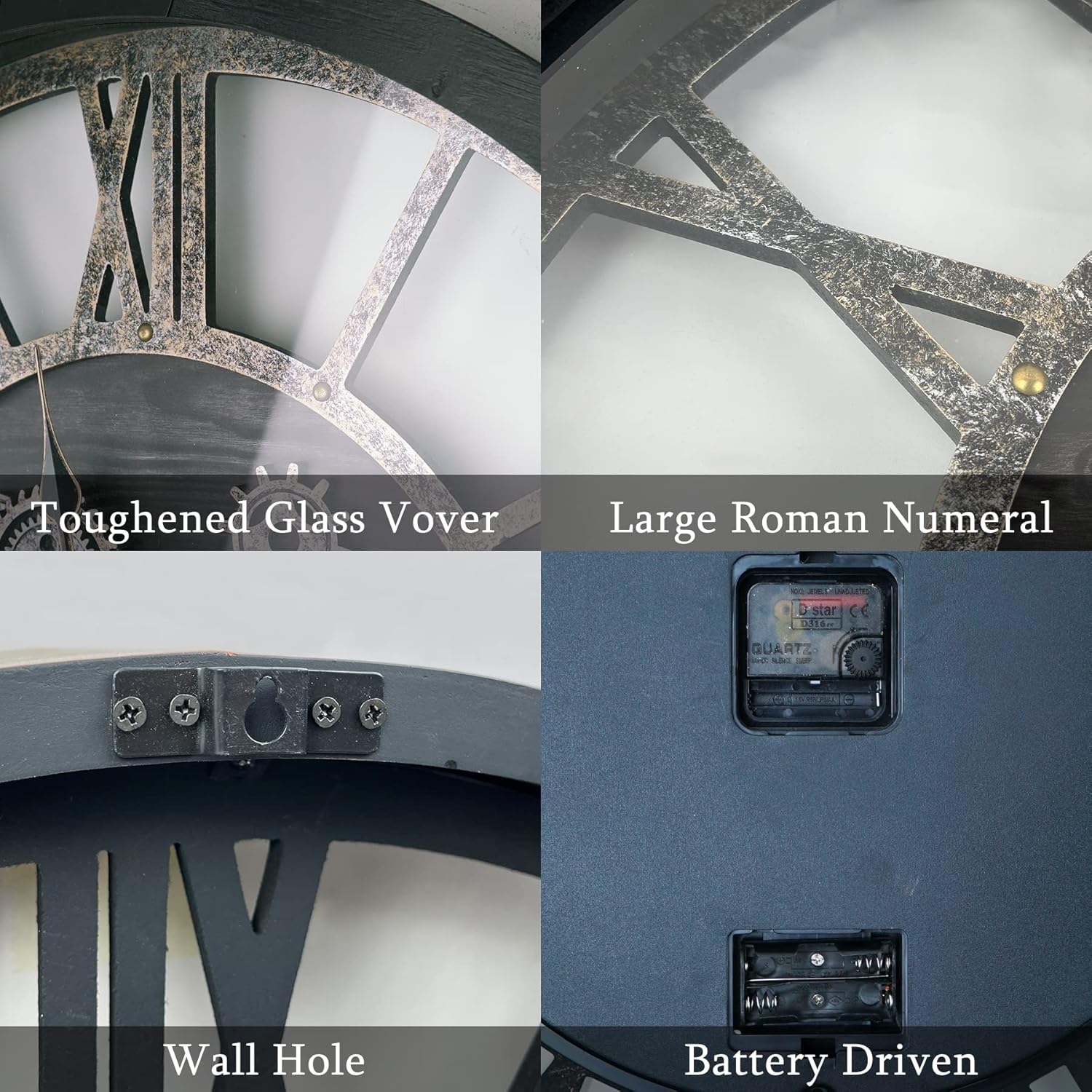 - 🕞Real Rotating Gears: The exposed gears on this large wall clock are real and rotate independently of the pointers. With a dust proof glass cover and battery powered operation, the gears rotate almost silently, providing a unique and dynamic way to experience time.
