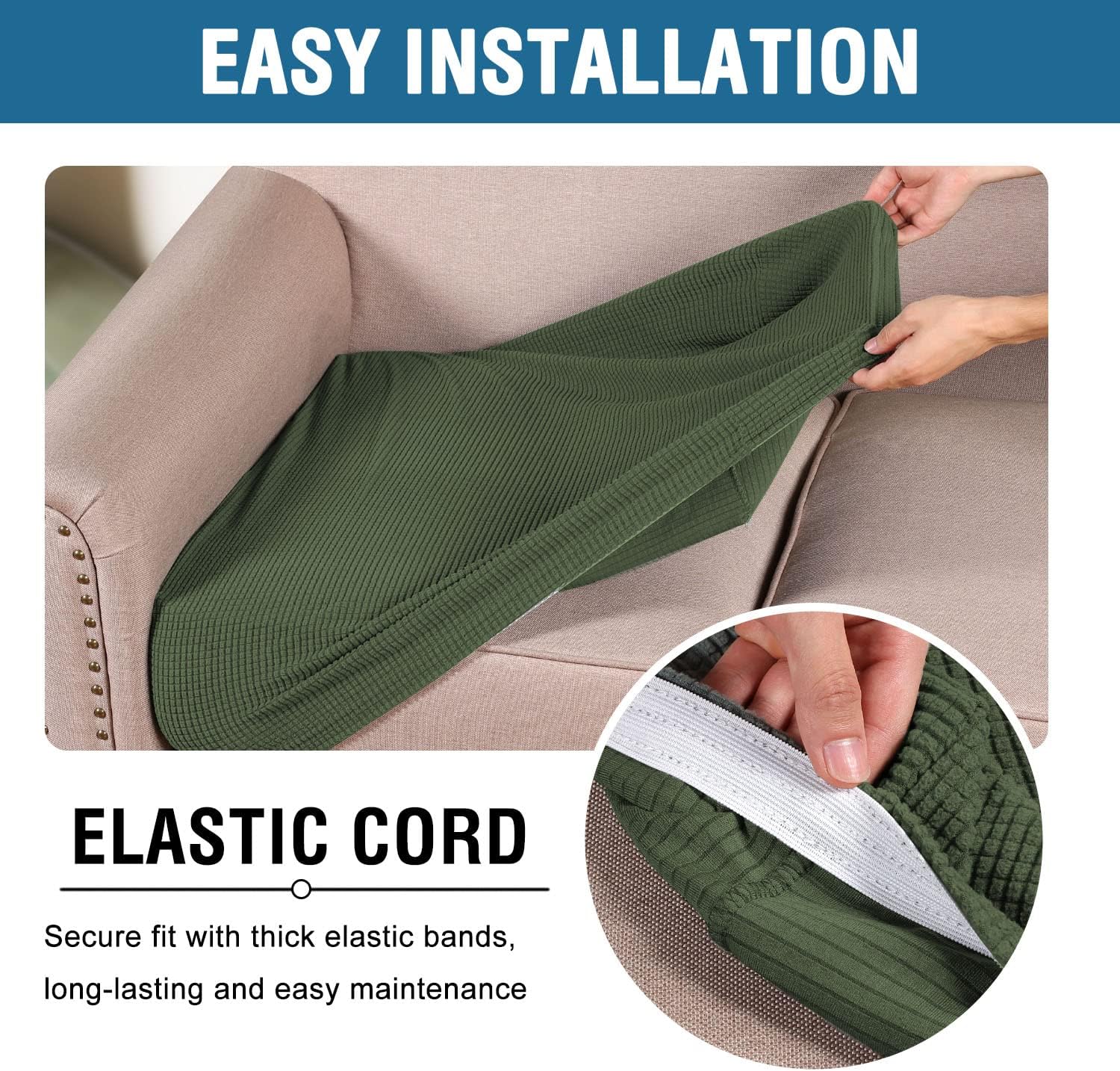 - NON SLIP: Effortless for installation (guide photos on selling page), sewn with thick elastic loops to cover the bottom edges. It is easy to install and take off, making your home more harmony, high recommended for both leather and cloth furniture