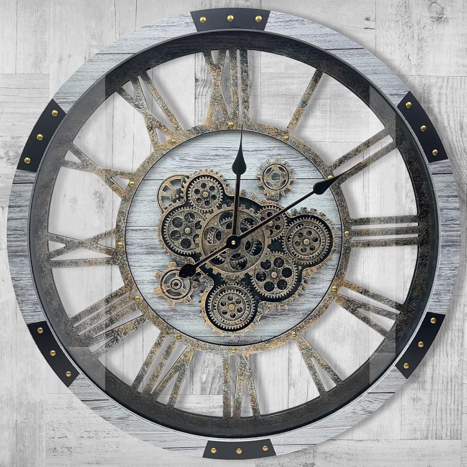 DORBOKER 30" Original Moving Gears Wall Clock, Large Industrial Wall Clock for Living Room Decor, Solid Wood Vintage Farmhouse Steampunk Rustic Clocks for Wall Decor,Silver Grey