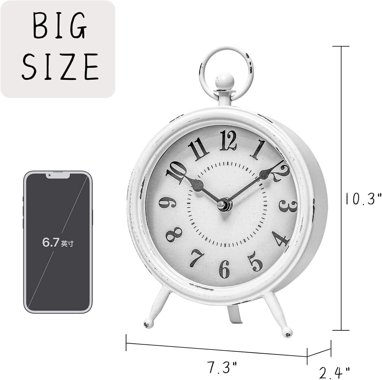 - ✅【HIGH-QUALITY ANTIQUE DECOR】The distressed metal and iron build of this standing small vintage table clock is true to its rustic design. This chic table clock will make a statement with its bright white background, easy-to-read numeral display.