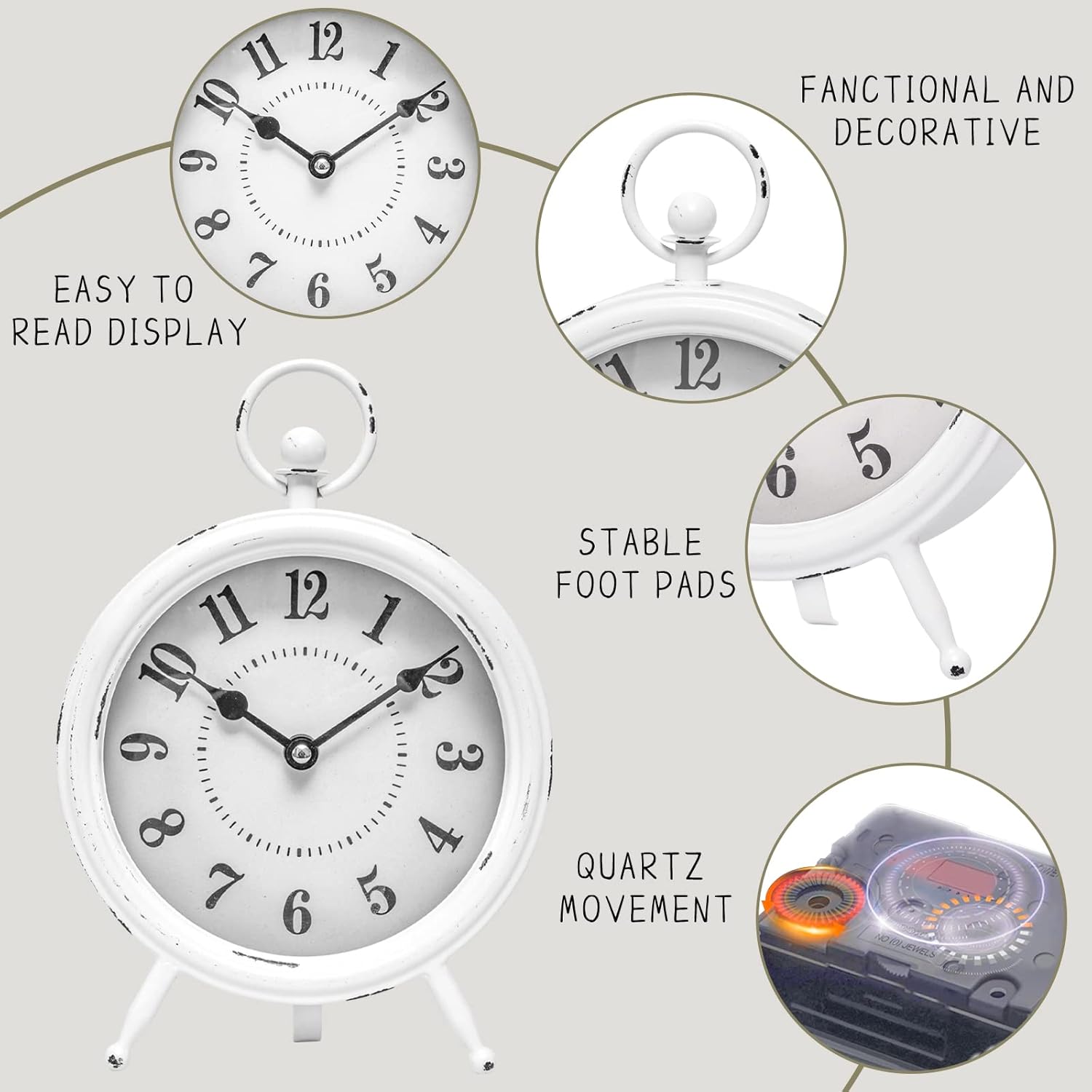 Vintage Rustic White Table Clock on Stand, Decorative Desk & Shelf Clock, Rustic Mantel Farmhouse Non-Ticking