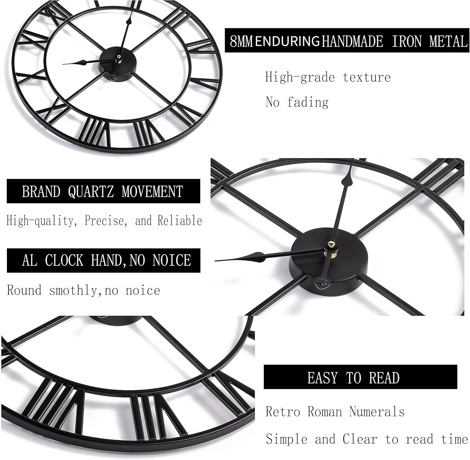 - 【Sturdy and Easy to Read】 - Equipped with high quality sweeping movement, thus the large clock is more sturdy and accurate.Painted with a layer of paint in the cover of the clock making it anti-moisture and anti-deformation. With easy to read bold Roman numerals on the surface, You can see the hands easily from far away.