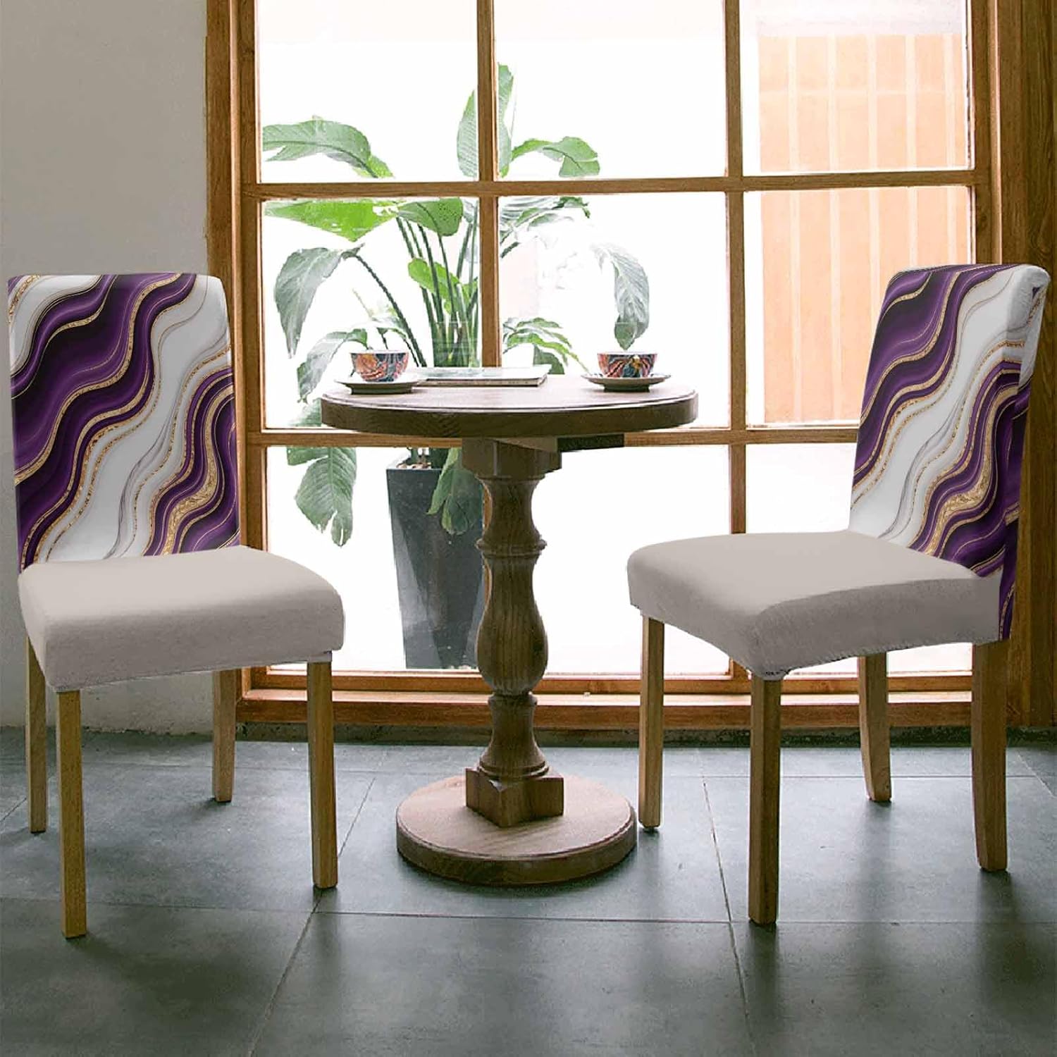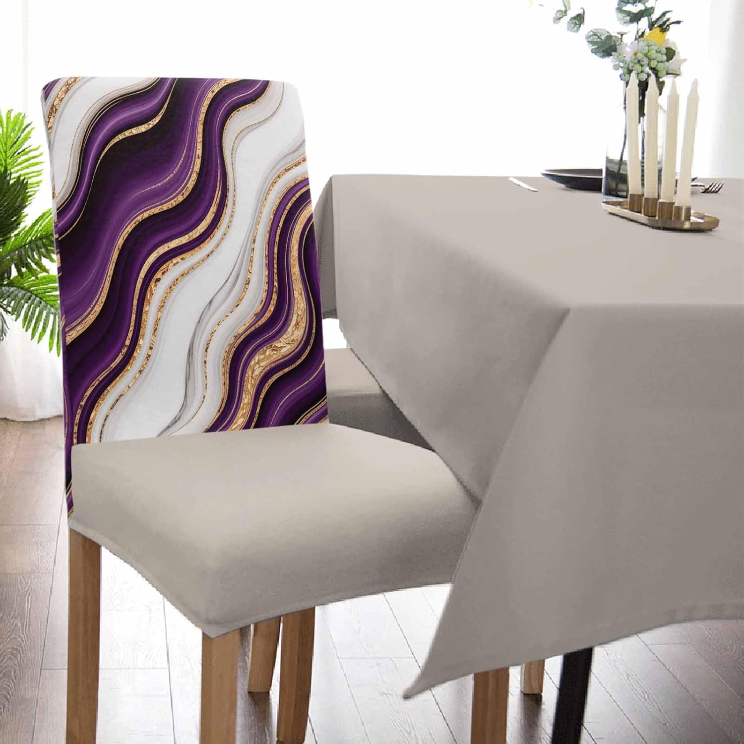 6 Pcs Dining Chair Covers Stretch Spandex Slipcovers Purple Marble Gold Inlay Removable Washable Dining Room Seat Cover Cushion Protector for Home Hotel Banquet Decor Abstract Geometric Stripes