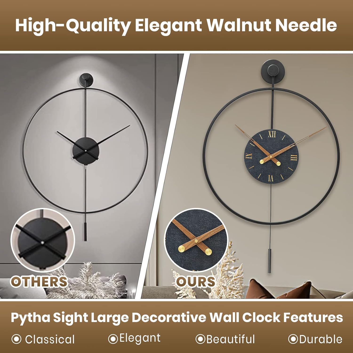 - 【Elegant Walnut Pointer】Pytha Sight wall clock modern uses walnut pointer,which is elegant and generous,not easy to deformation.The texture is very good,we carefully carved every detail,only to present classic,beautiful wall clock for you.It's not just a large wall clock,it's a work of handicraft art.