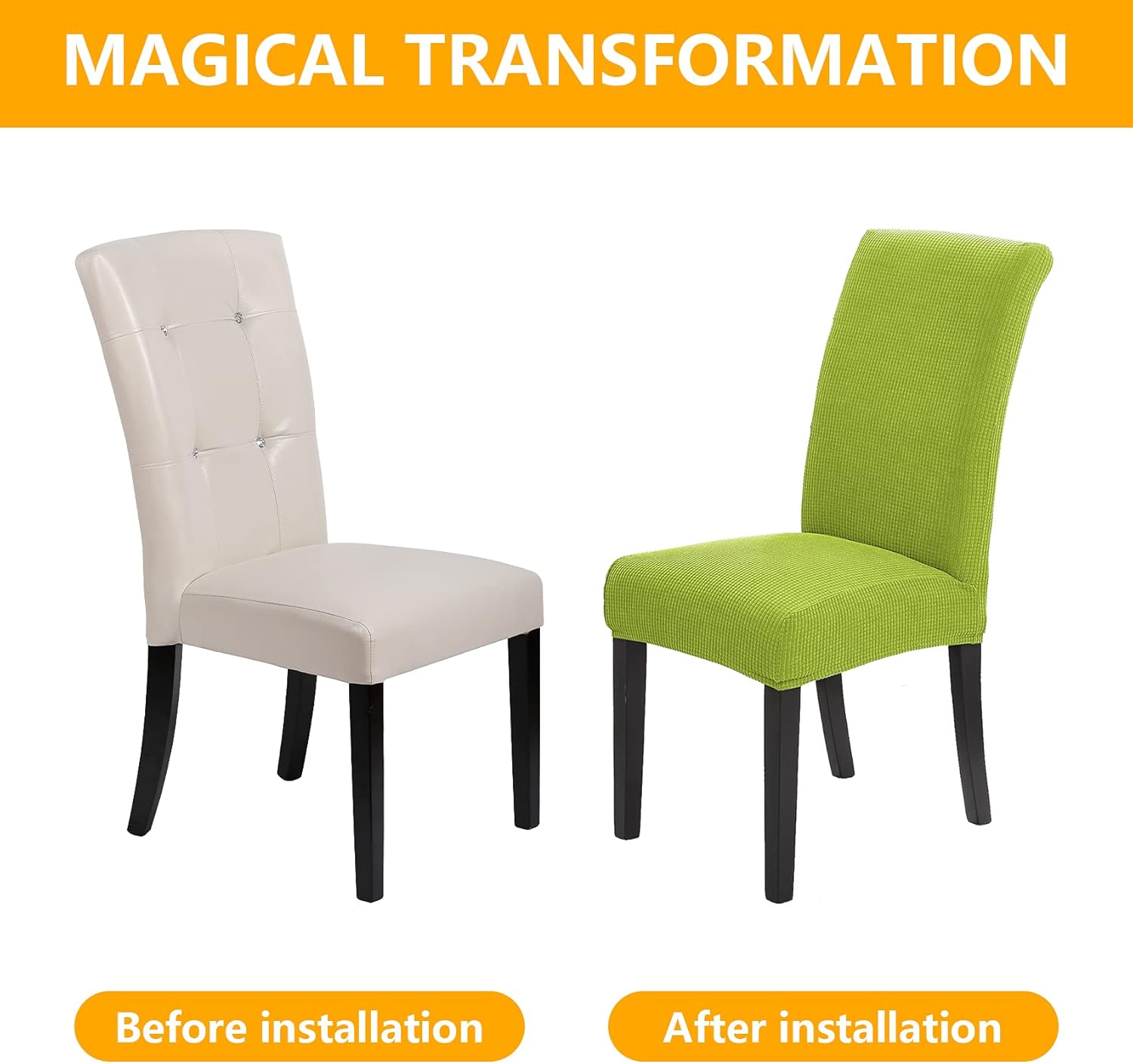 - Easy Installation, Simple Care. Easily slip on, instantly transform chairs to a brand new look. Machine washable in cold water, gentle cycle, no bleach, Ironing free.