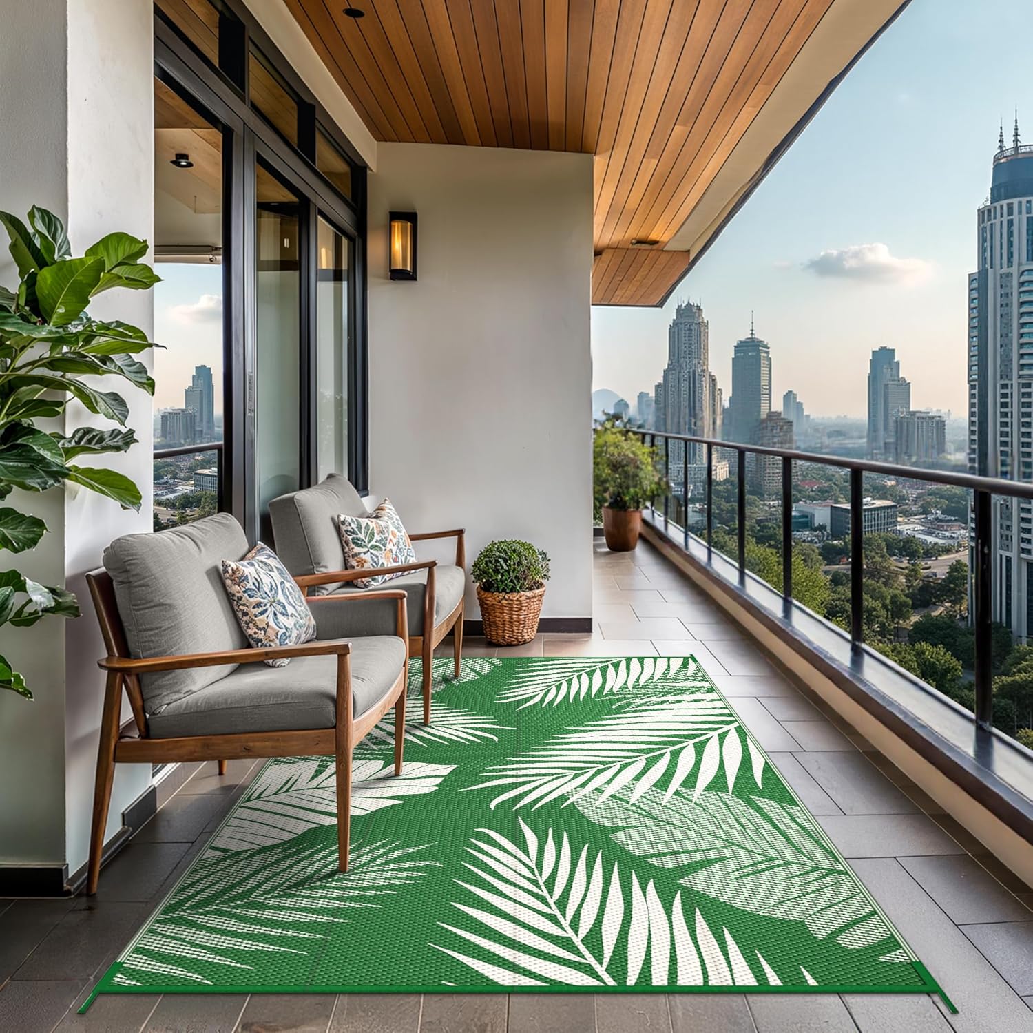 - 【PALM LEAF DESIGN & TWO-SIDED PATTERN】GENIMO reversible outdoor rug is designed with a double-sided pattern, completing the unique layout of multiple palm leaves. The two shades of dark green and white achieve the ultimate fusion. Either side can blend perfectly with nature and look very full and comfortable.