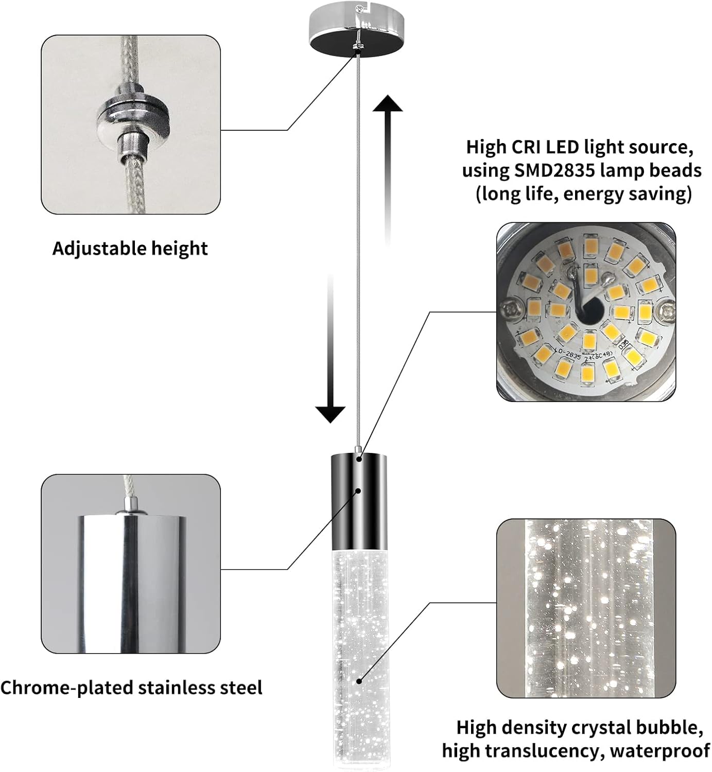 - 【Simple Modern style】:Modern pendant light stainless steel sconces and cylindrical crystal bubble lamp posts will add more luxury, noble, and artistic atmosphere to your home, let your island light add a high-end atmosphere to your kitchen.