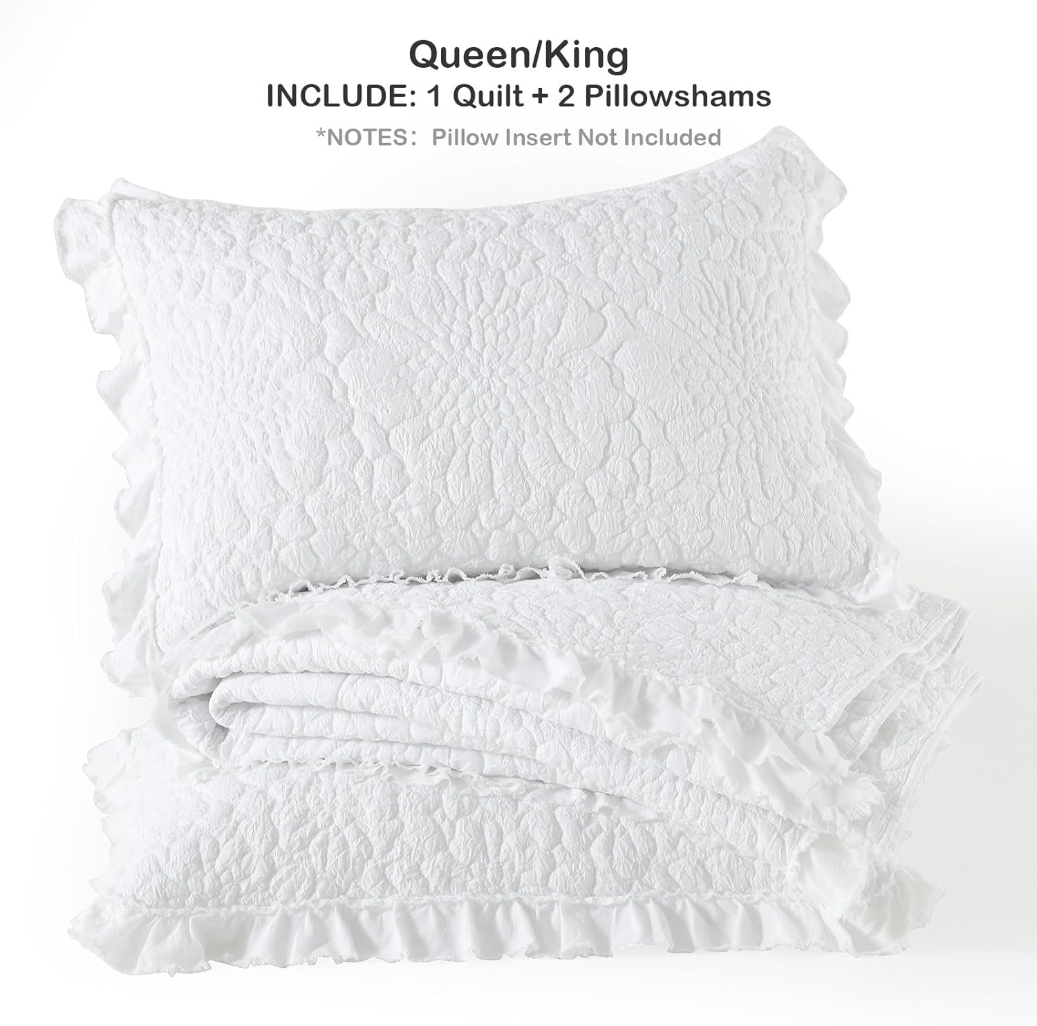 HORIMOTE HOME White Ruffled Quilt King Size, Stone-Washed Microfiber Lightweight Crinkled Farmhouse Rustic Shabby Chic Bedding Set, 3 Pieces Reversible Bedspread with Pillow Shams for All Season