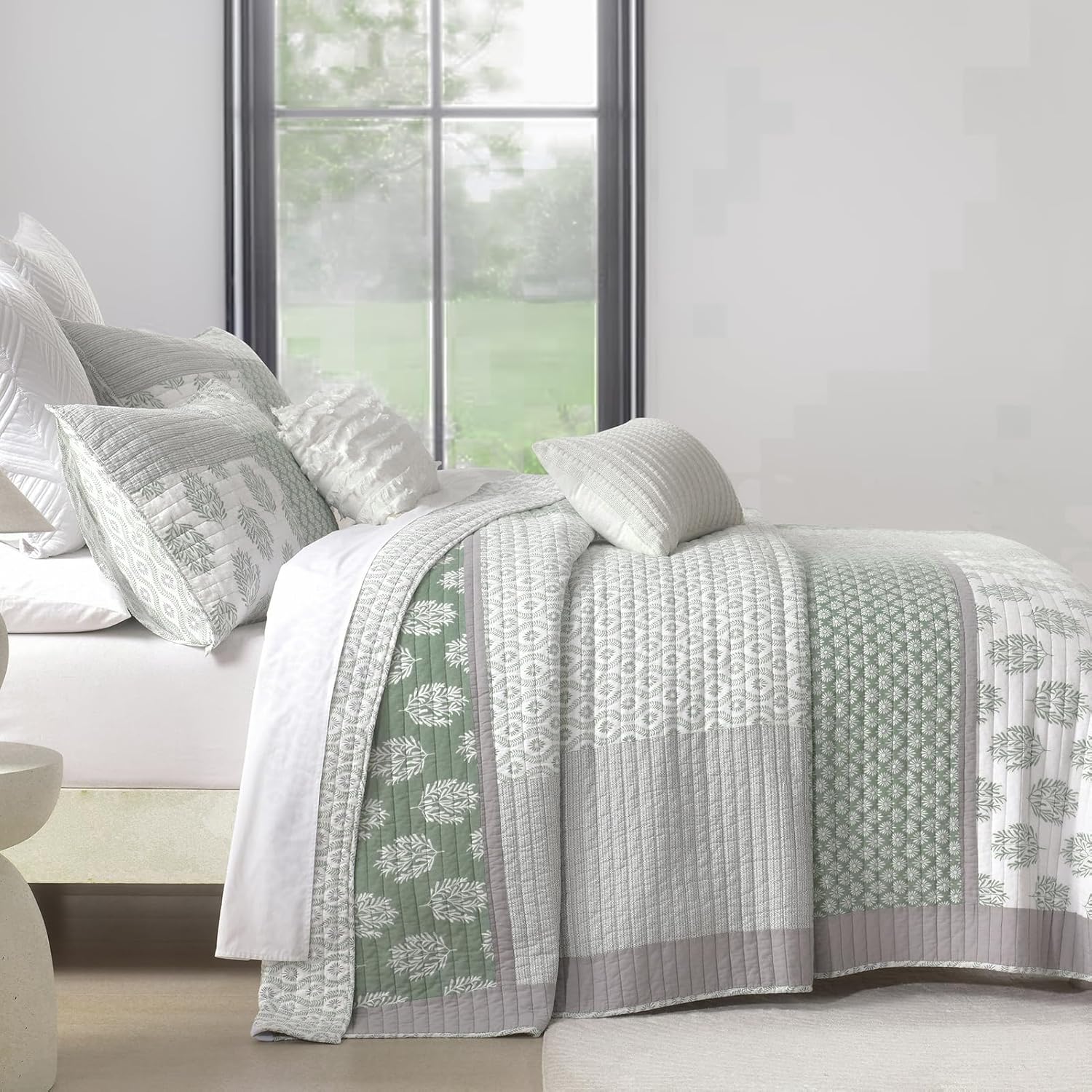PANGUSHAN Quilt Set King Size, 100% Cotton Bedspread Quilt Bedding Set, Patchwork Reversible Floral Quilt for King Bed, Greyish-Greens Bed Spread, Lightweight Comforter for All Season, 3 Pieces