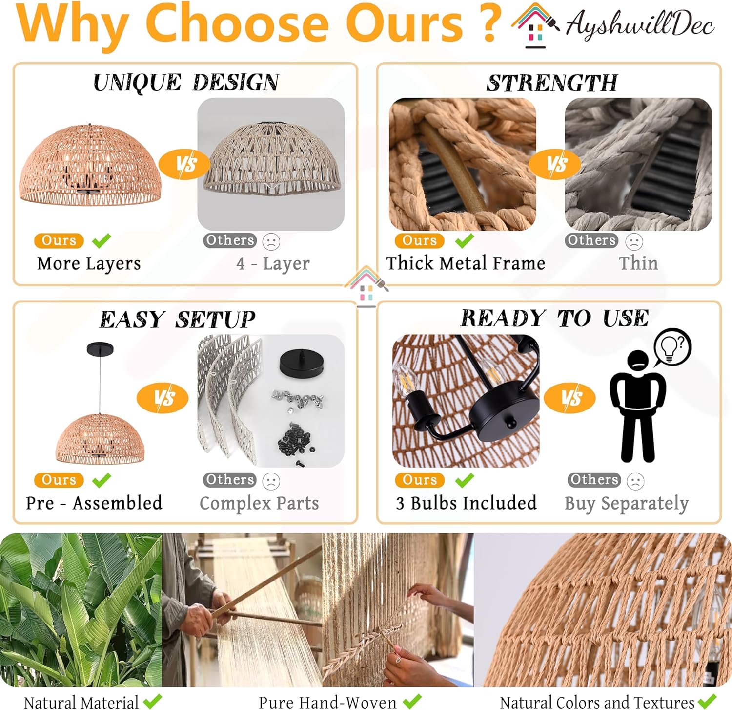 - [Bulbs Included & Dimmable]: Includes 3 regular warm white bulbs with E12 bases. When you buy other dimmable bulbs and combine it with a wall dimmer it can be fully dimmable. The bulb bases have a maximum power of 60W and this wicker pendant has a adjustable hanging rope length so you can use this fixture with confidence.