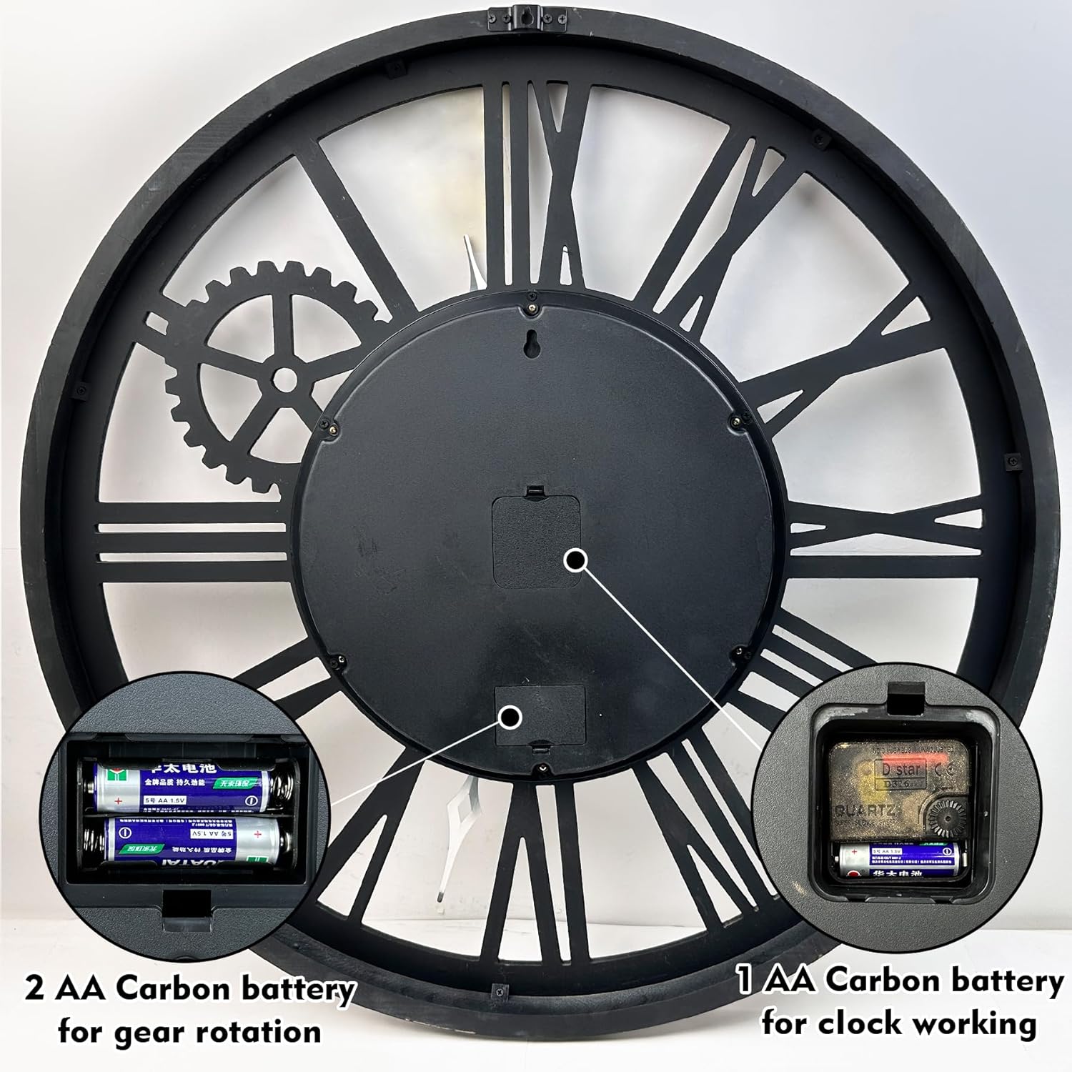 - ACCURATE TIME AND BATTERY OPERATED: Quality quartz sweeping mechanism for accurate time without any ticking sounds. Power by 3 AA Carbon battery operated (not included), large industrial clock takes 2 sets of batteries, one set for the clock and the other for gears that spin. Both of them can be used individually