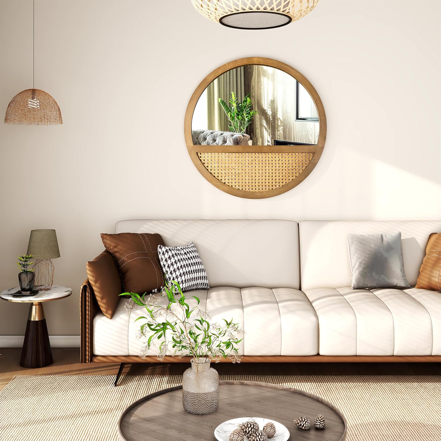 Rattan Round Mirror, 24 Inch Wall Mirror for Living Room Decor, Wooden Framed, Vintage Hanging Mirror, Hand-Woven for Wall Art Decoration