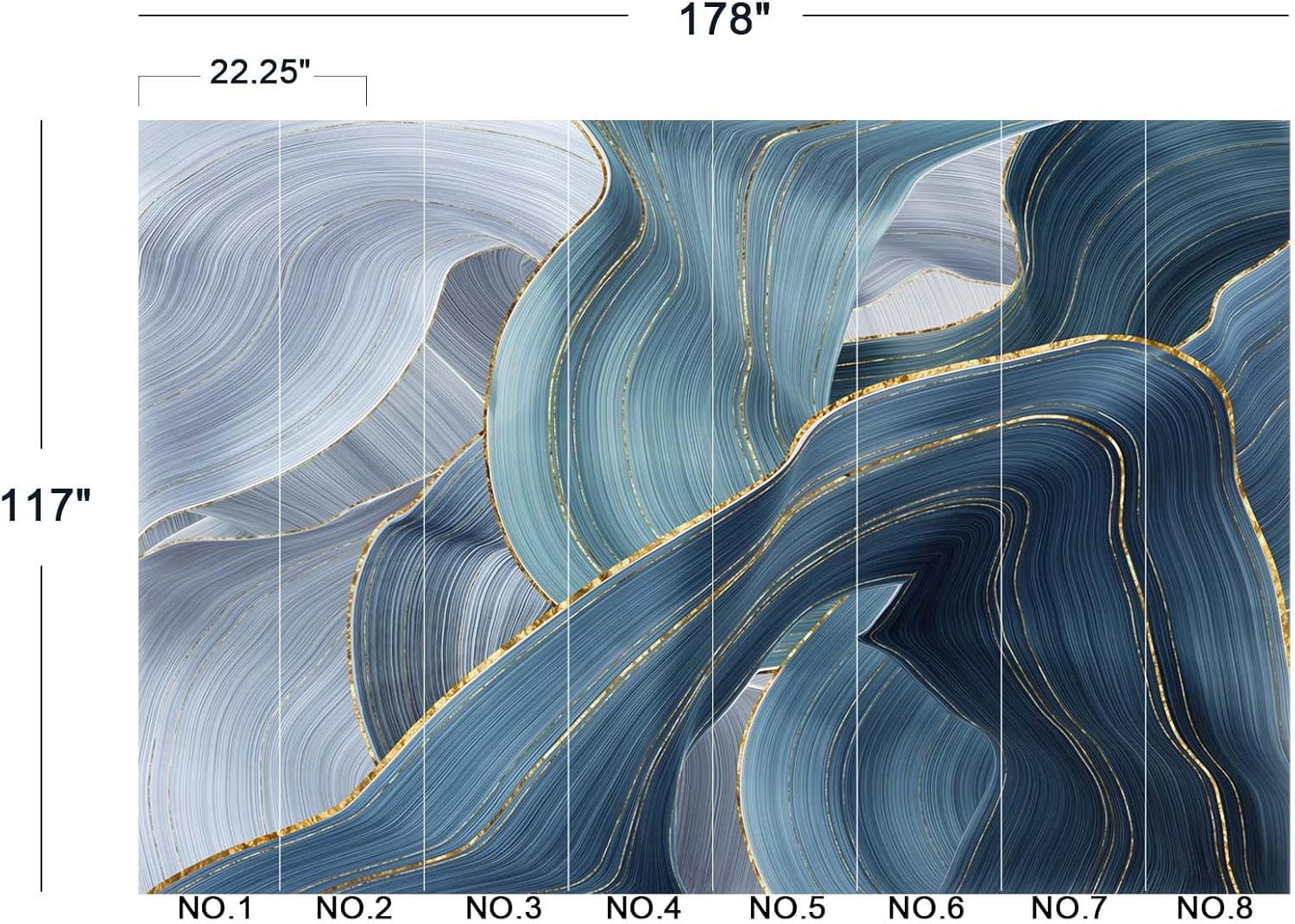 - The size of the wallpaper is 178" wide x 117" high and divided into 8 panels.