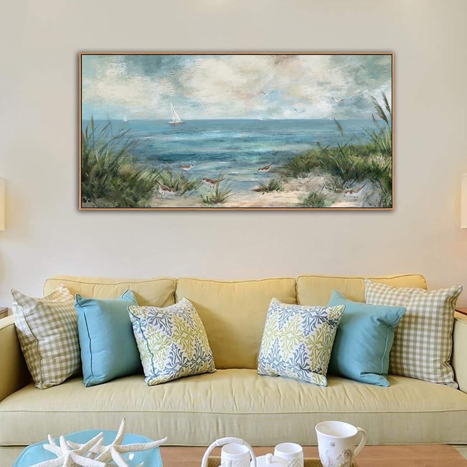 Sea Beach Framed Canvas Wall Art Vintage Seascape Canvas Prints Wall Decor Ocean Sailboat Seagull Canvas Pictures Beach Bird Reed Canvas Painting Artwork Living Room Bedroom Decoration 29" X 58"
