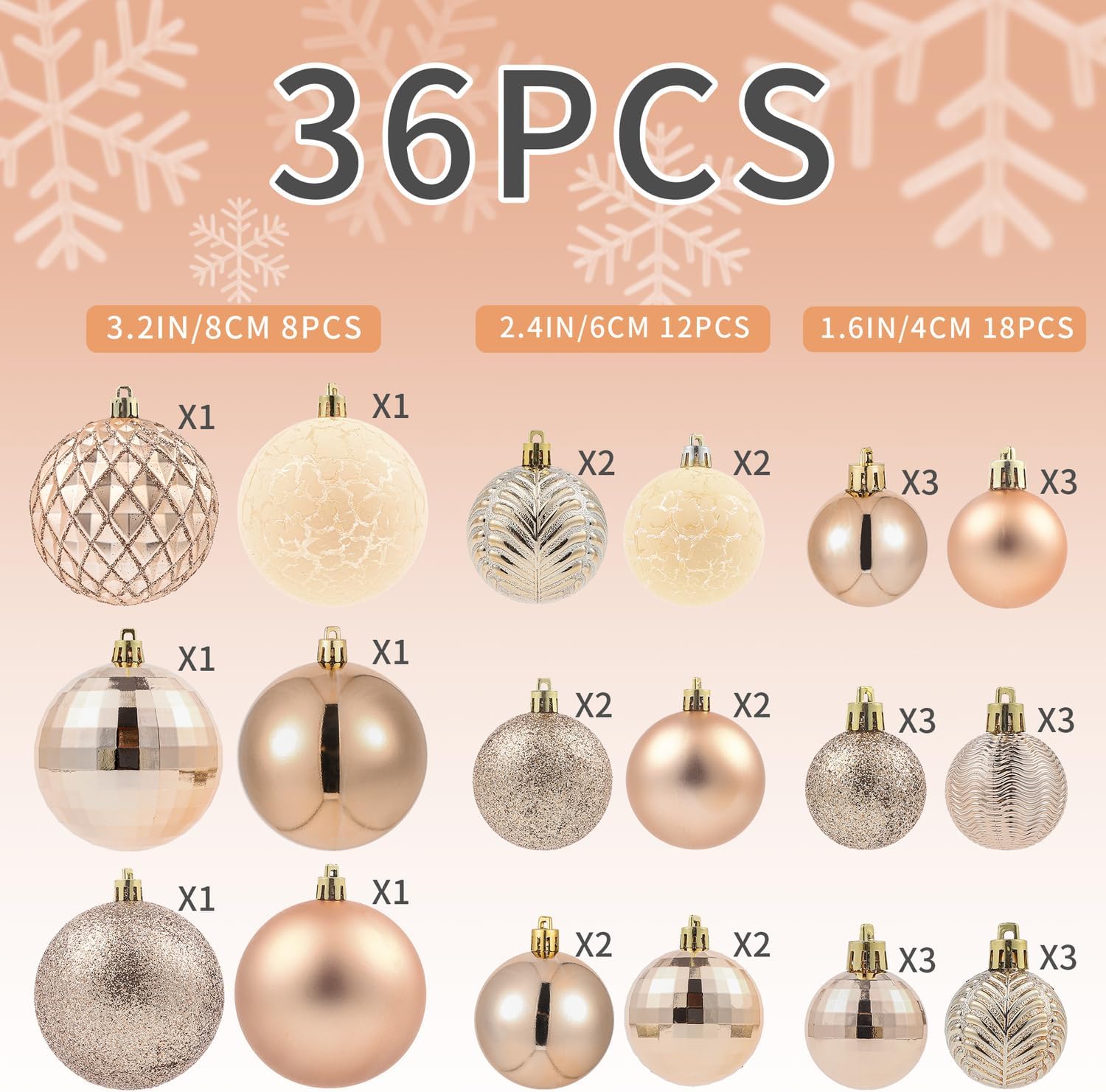 - Multiple Style Matching - With 3 sizes and 18 different styles, the LANGXUN Copper Orange Christmas ornaments balls set includes a total of 36 balls. This set features 8 balls measuring 3.2 inches, 12 balls measuring 2.4 inches, and 18 balls measuring 1.6 inches.