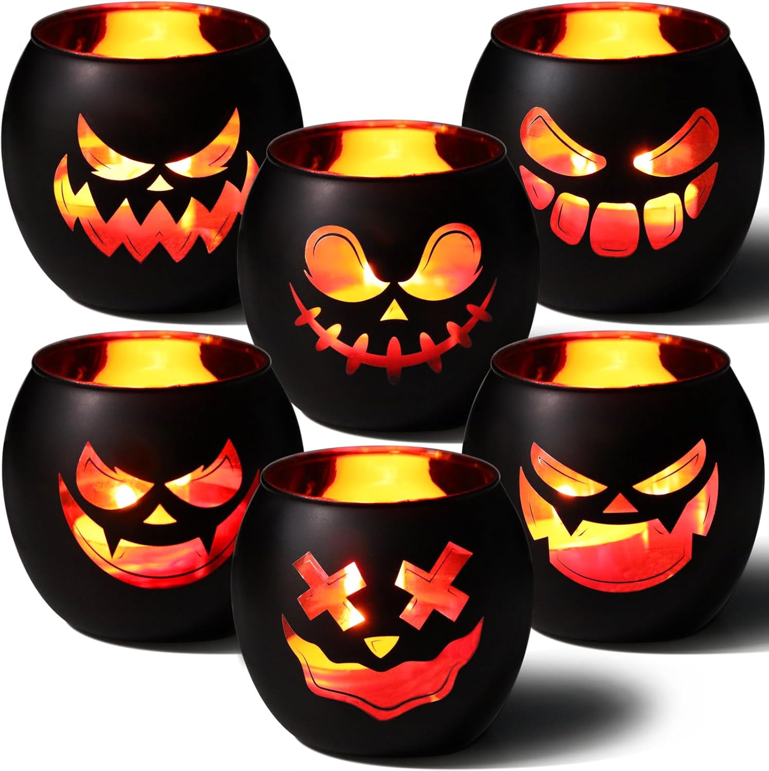 - Black Votive Candle Holders: Set of 6 glass votive holders, each adorned with 6 cute Halloween grimace patterns. The precisely crafted black frosted patterns, achieved through advanced techniques like electroplating and laser engraving, gleam in captivating gold and shine