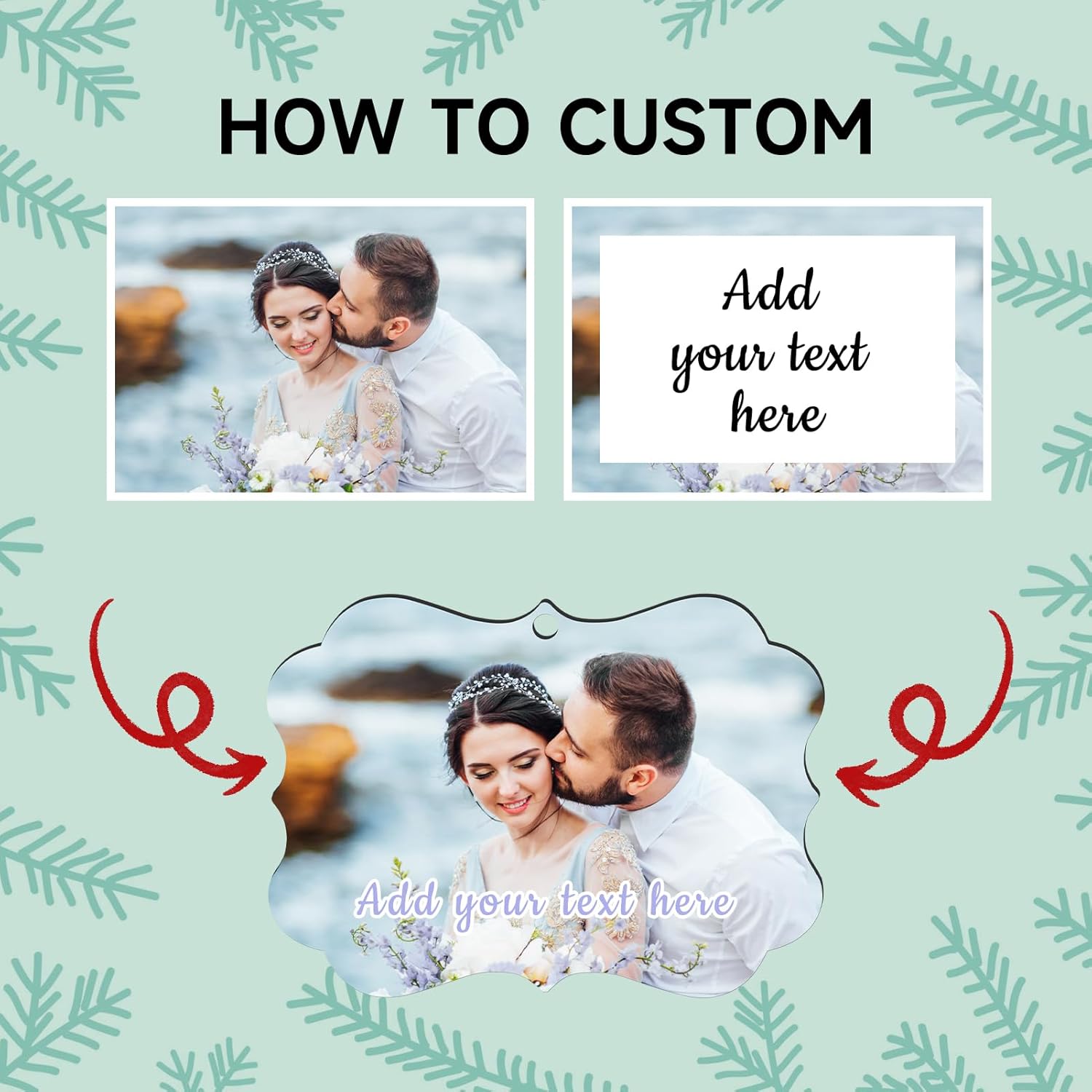 • 【Custom Photo Text Christmas Ornaments】Click on the " Customize Now " button to design your own Christmas ornament special with desired Photo, Picture, Logo, Text. Simply upload any photo, fit by the corners. Choose your font color, fill in the optional blank with your text. Our designers will do the rest.